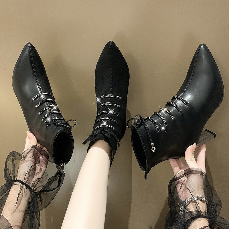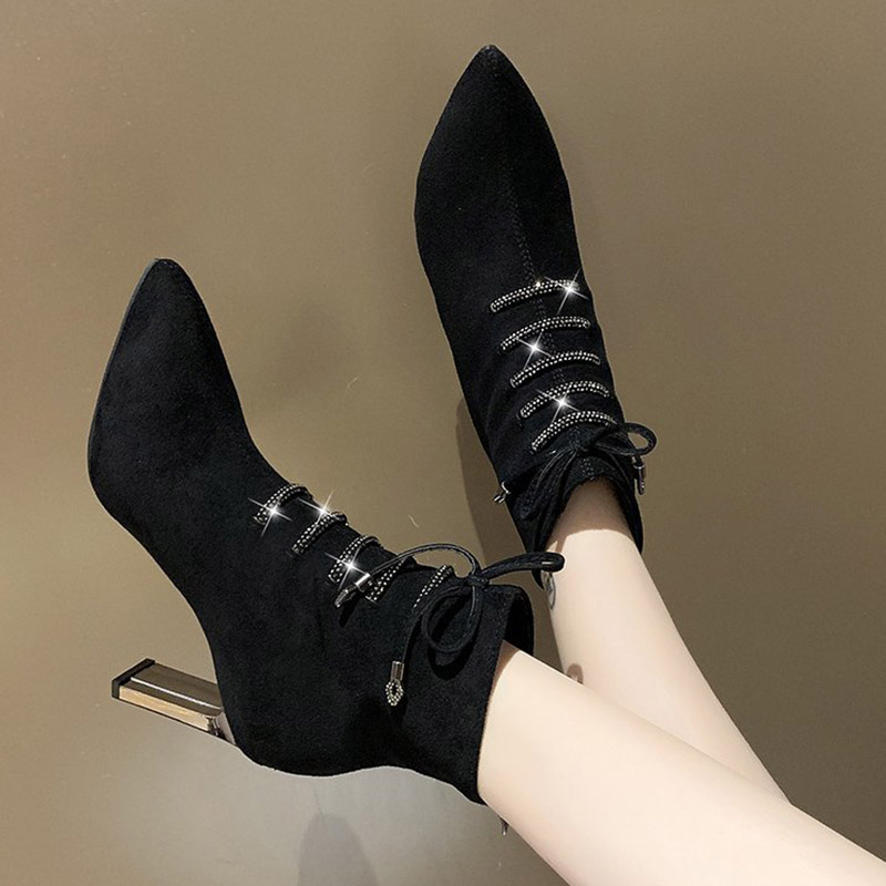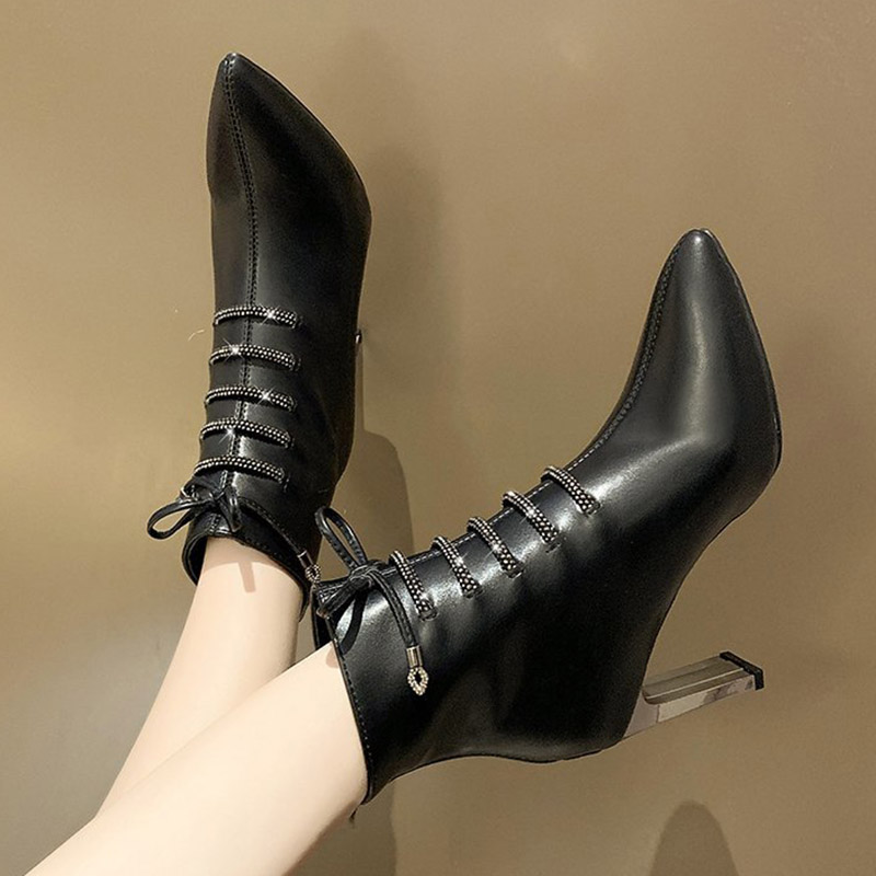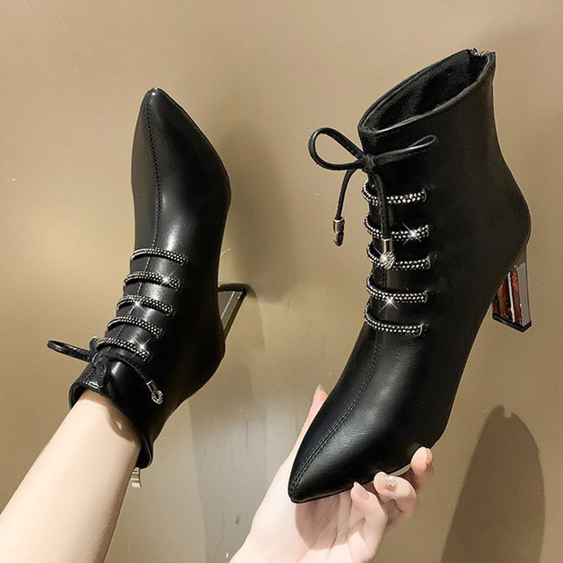 Gladiator Boots Women Lace Up Ankle Boot Winter High Heels Dress Shoes Fashion Zip Stitch Booties Pointed Toe Pumps 8606N