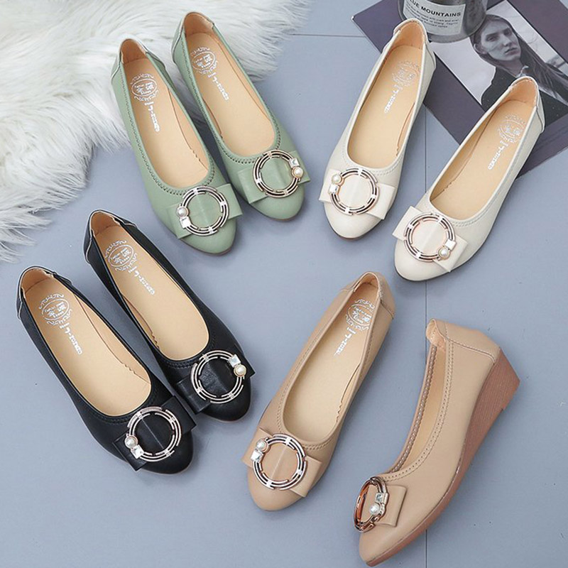 Spring Autumn 3cm Mid Heels Women Wedges Boat Shoes Pearl Slip on Shoes Woman Pumps Black Office Lady Shoes Black Beige 8675N