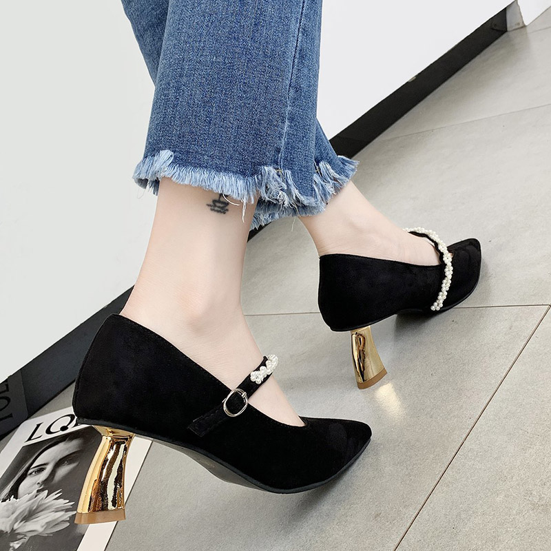 Designer Shoes Flock String Bead Mary Janes Shoes Women Pointed Toe Pearl Pumps Gold Retro Ladies Shoes zapatos mujer 8731N
