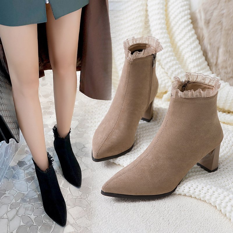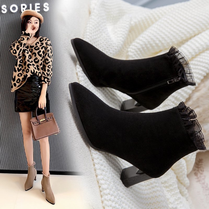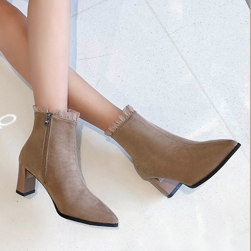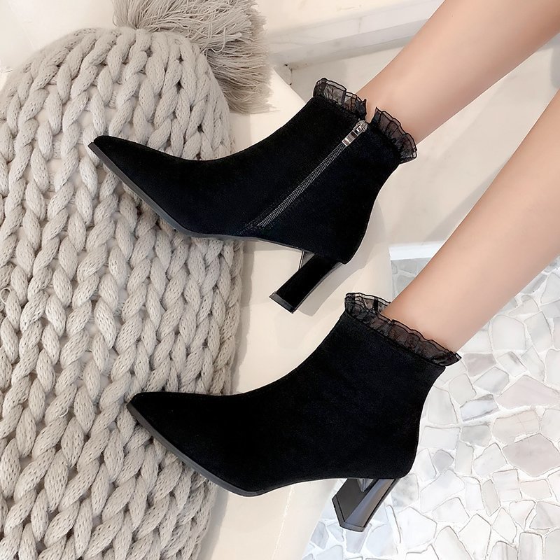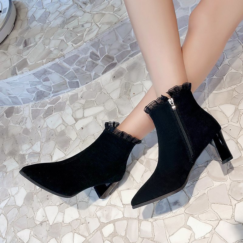 Cheap Ankle Boots, Buy Quality Shoes Directly from China Suppliers:Women Ruffles Ankle Boots High Heels Dress Shoes Flock Pointed Toe Booties Lace Pumps Winter Autumn Botas Mujer Black 8735N