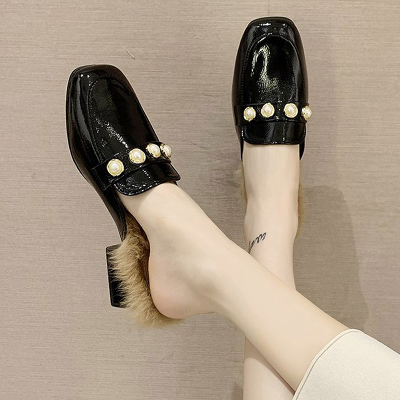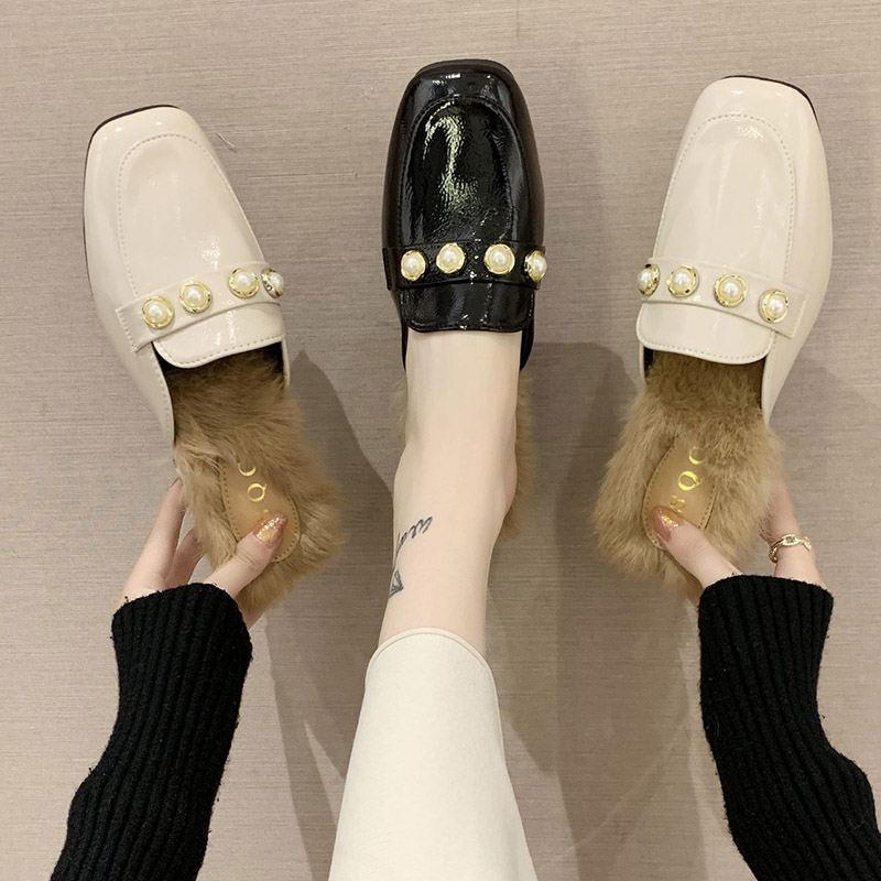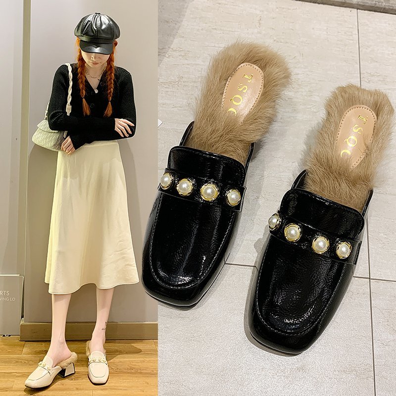 Winter Faux Fur Women Slippers Pearls Slip on High Heels Casual shoes Square Toe Leather Mule Out Side Slides Bead 8876N