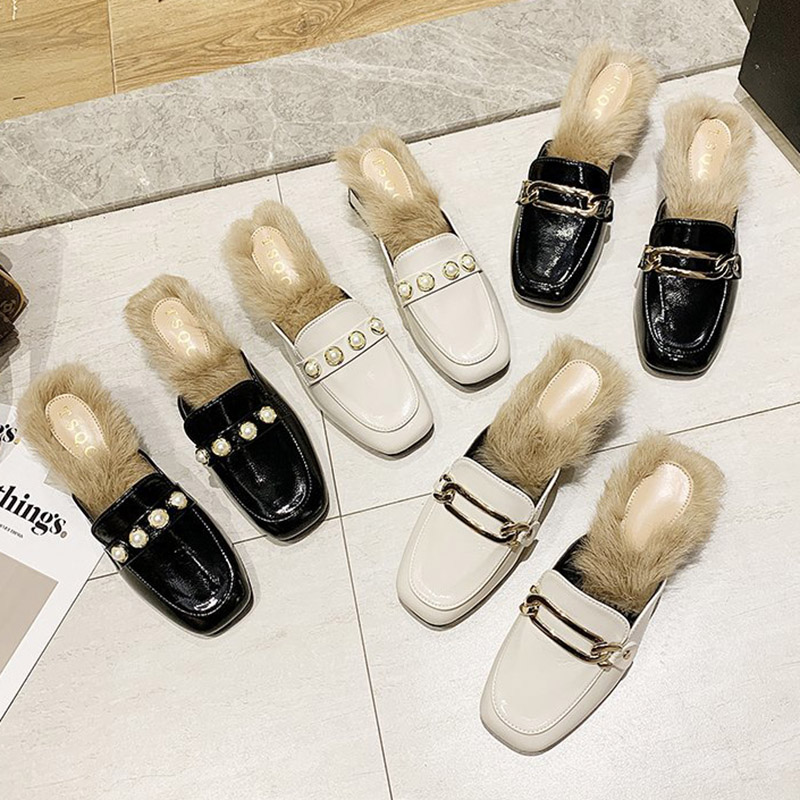 Cheap Slippers, Buy Quality Shoes Directly from China Suppliers:Winter Faux Fur Women Slippers Pearls Slip on High Heels Casual shoes Square Toe Leather Mule Out Side Slides Bead 8876N