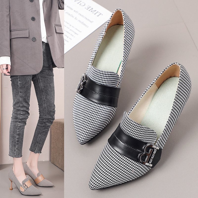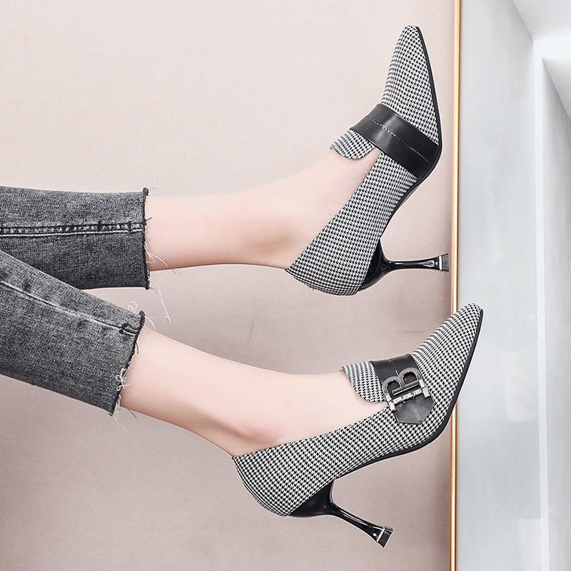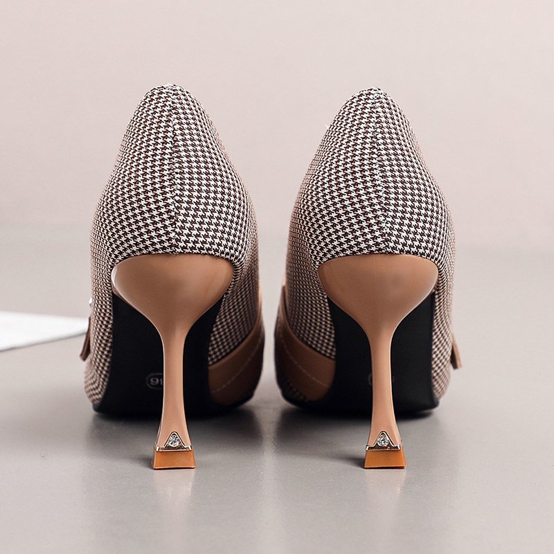 Spring Autumn Women Dress Shoes Plaid High Heels Patchwork Stilettos Pumps Pointed Toe Ol Office Ladies Shoes Buckle Pumps 8890N