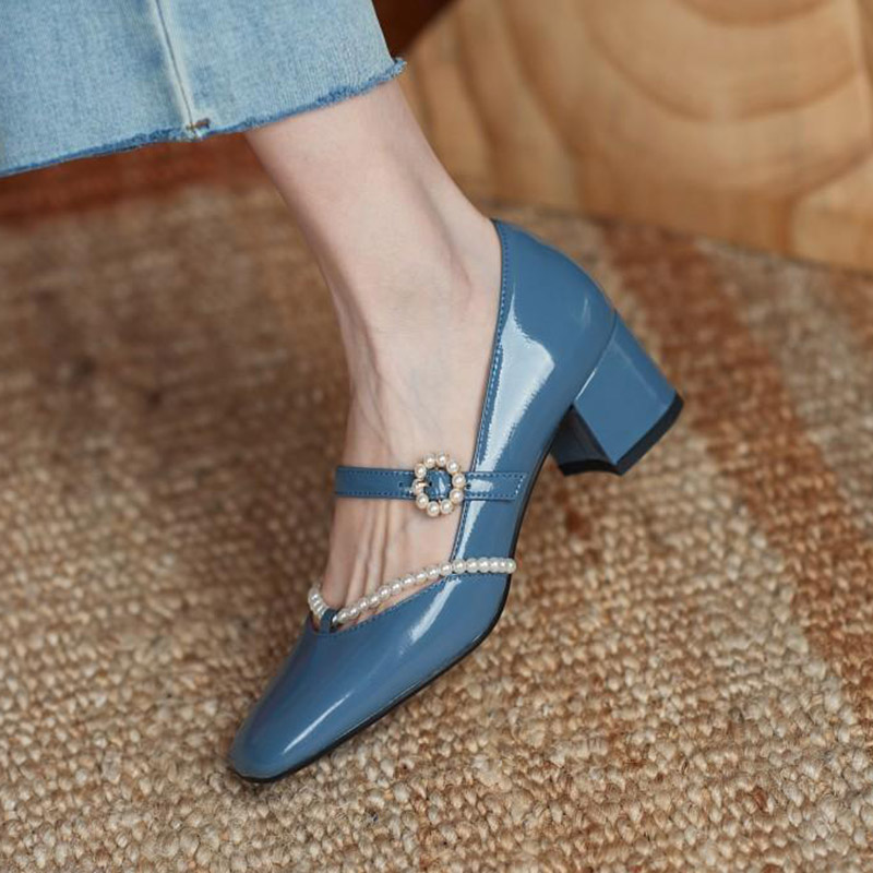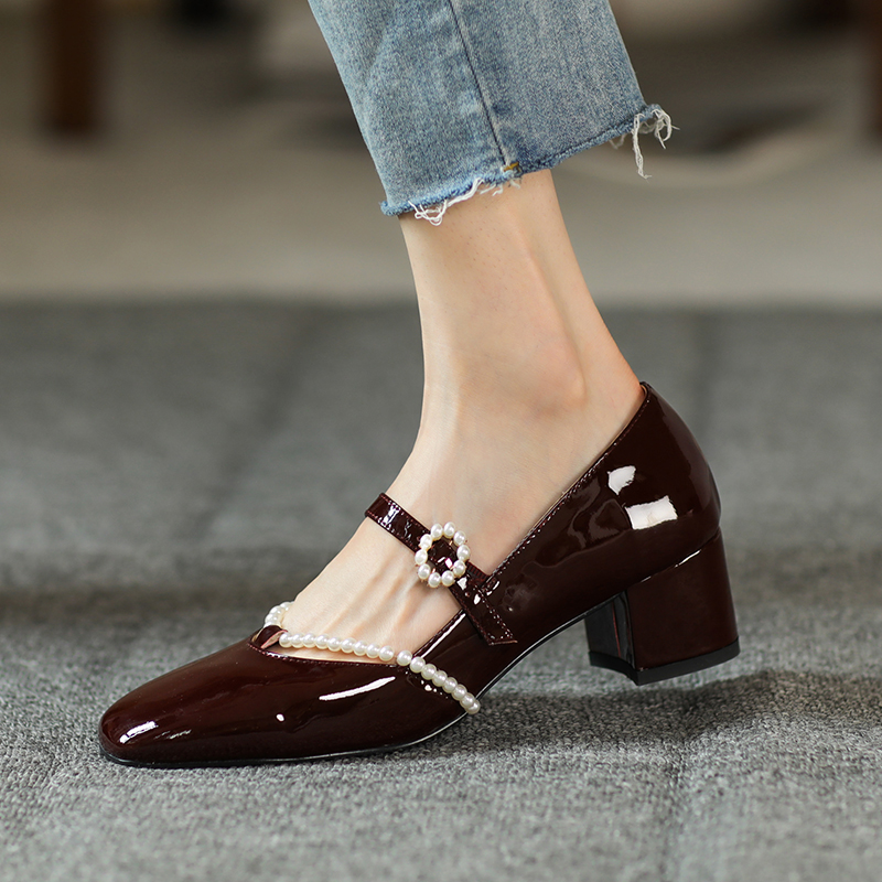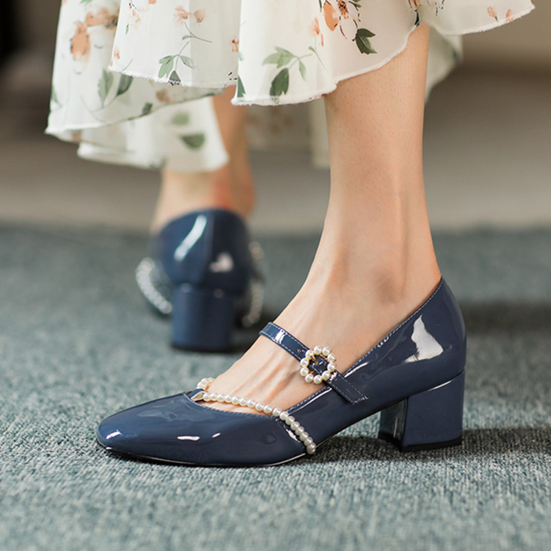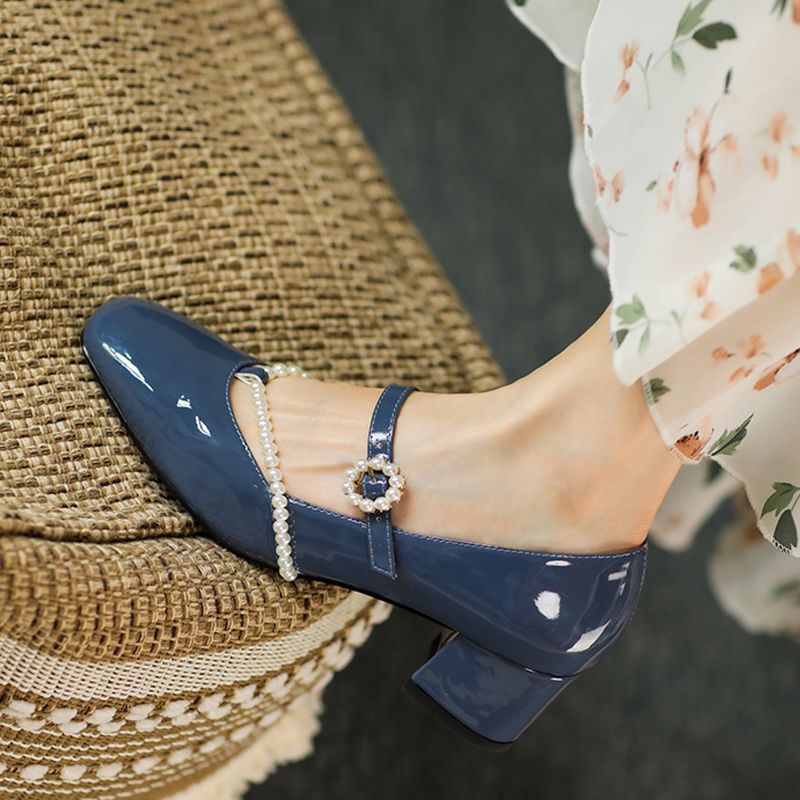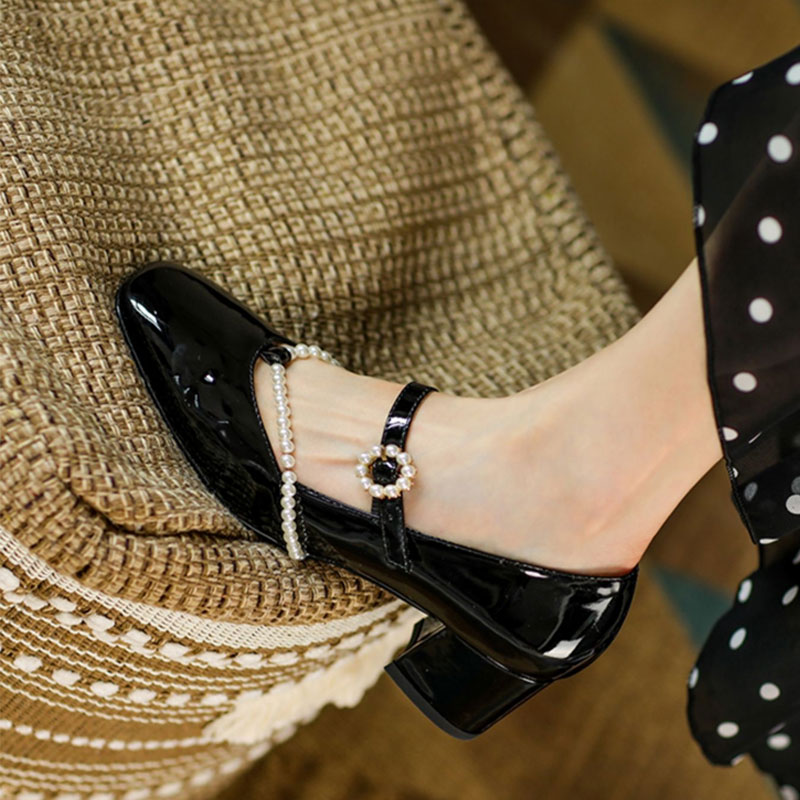 Spring New Women Dress Shoes String Bead Mary Janes Shoes Patent Leather Pearl Buckle Strap Mid Heel Ladies Shoes 8908N