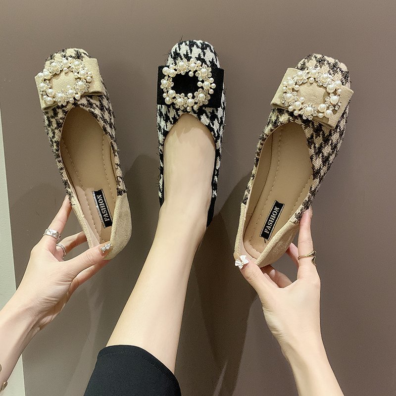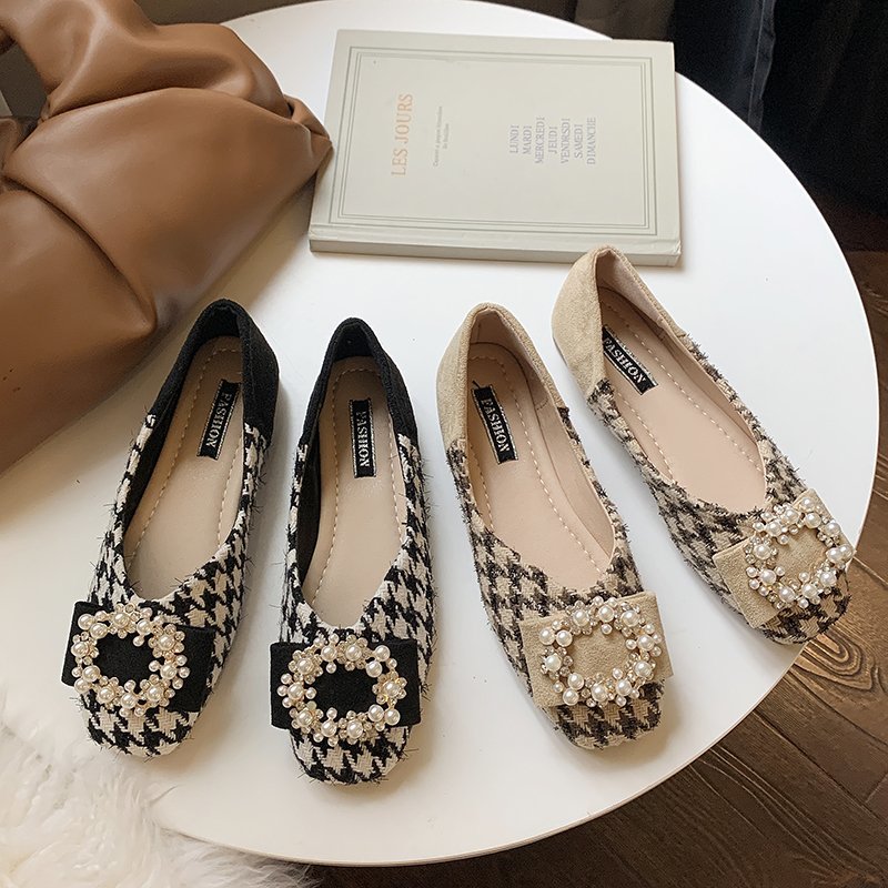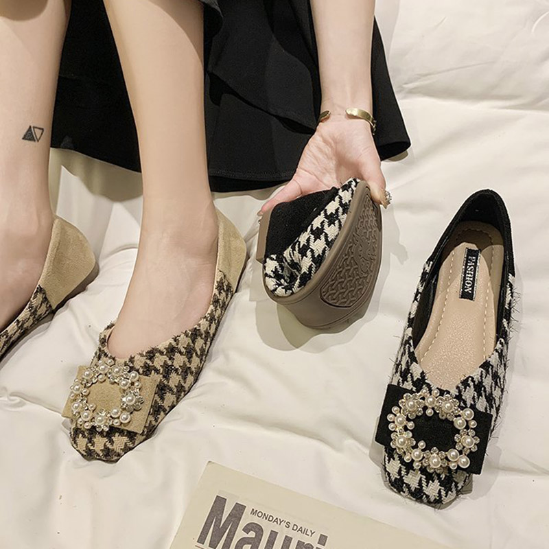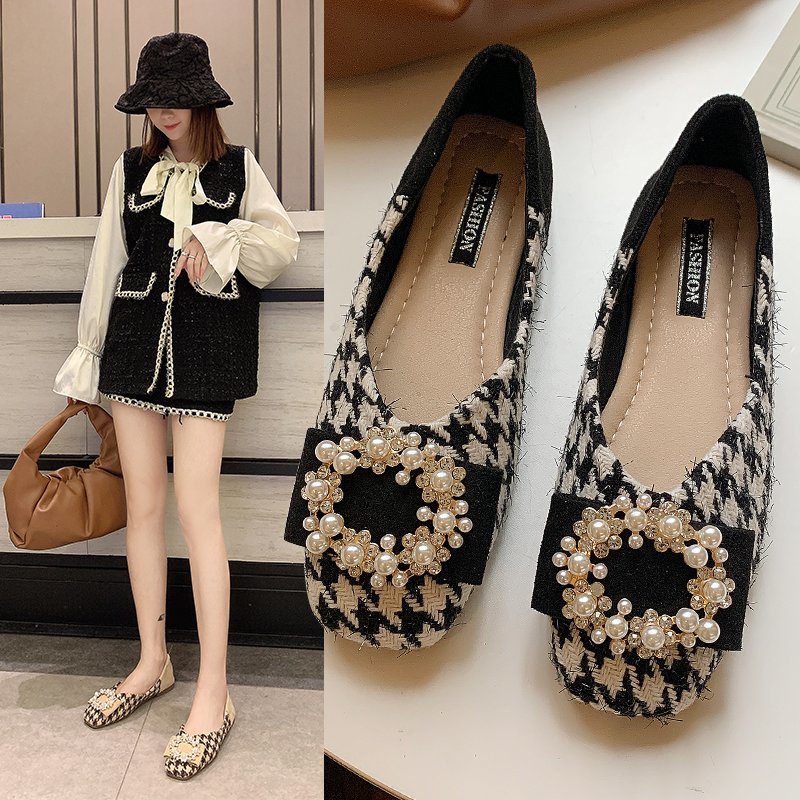 Spring Autumn Women Flats Pearls Costume Tweed Slip on Flat Shoes Ladies Crystal Plaid Boat Shoes zapatos mujer 8912N
