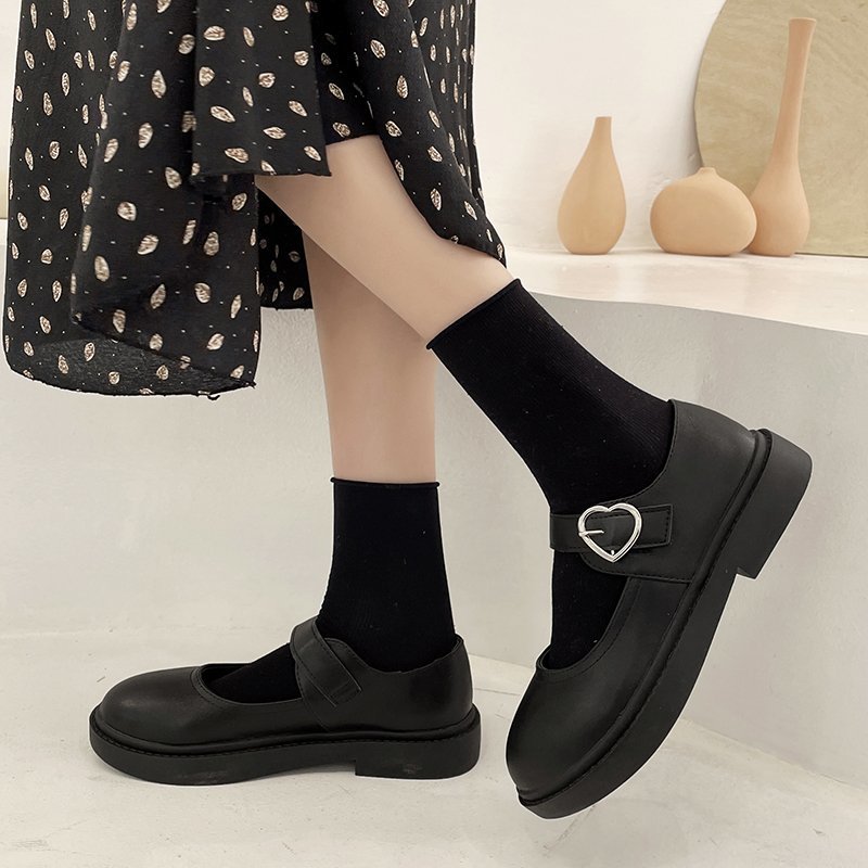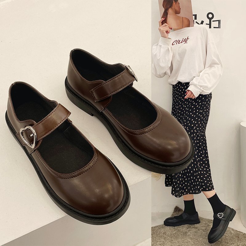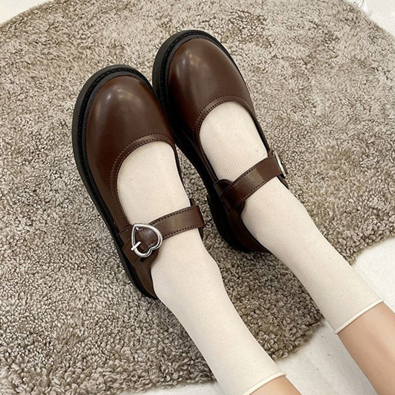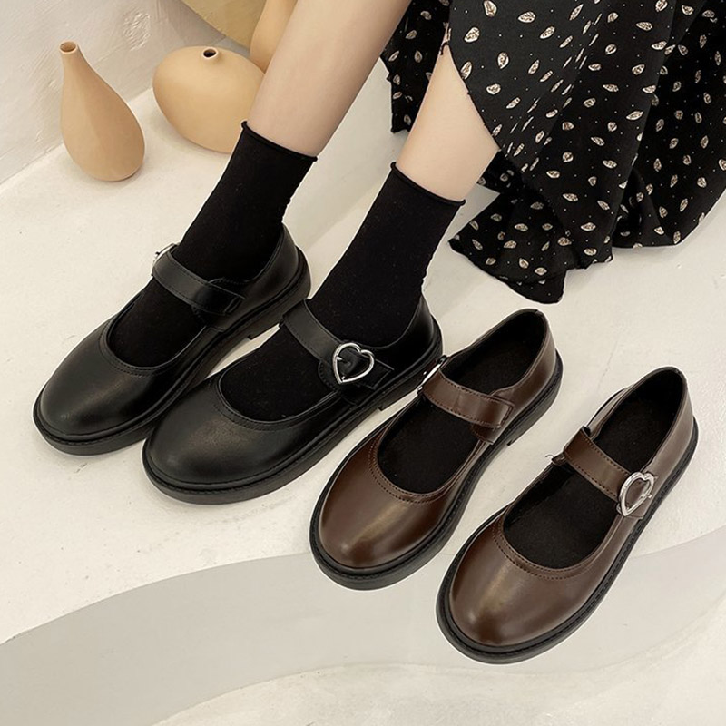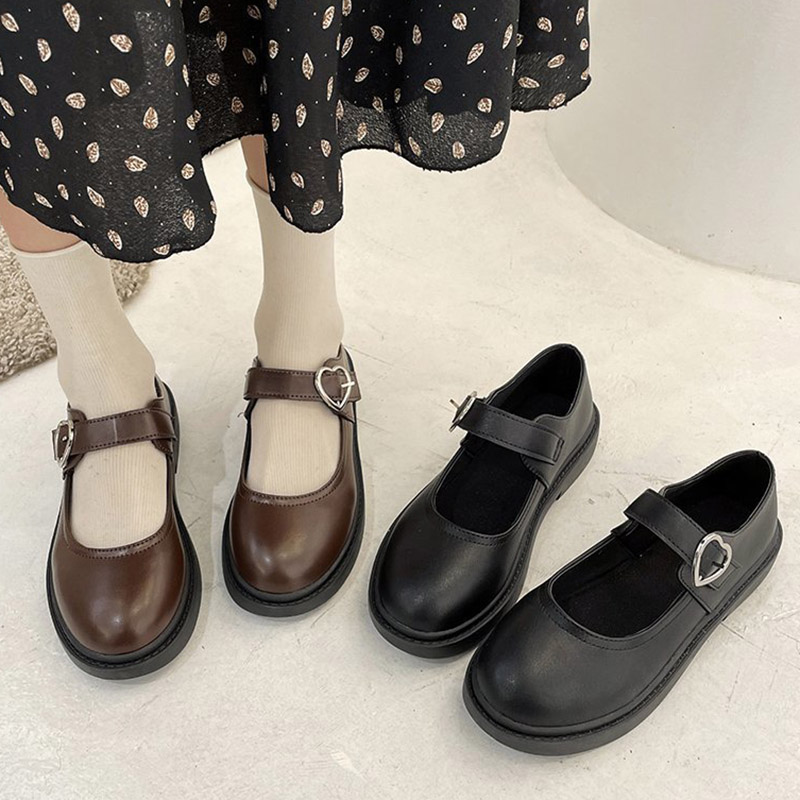 Lolita Shoes Heart Buckle Mary Janes Shoes Leather Women Flats Shallow Girls Casual Shoes Black Brown zapatos mujer Spring 8948N