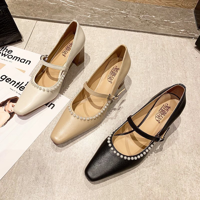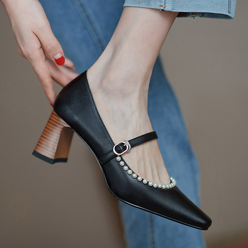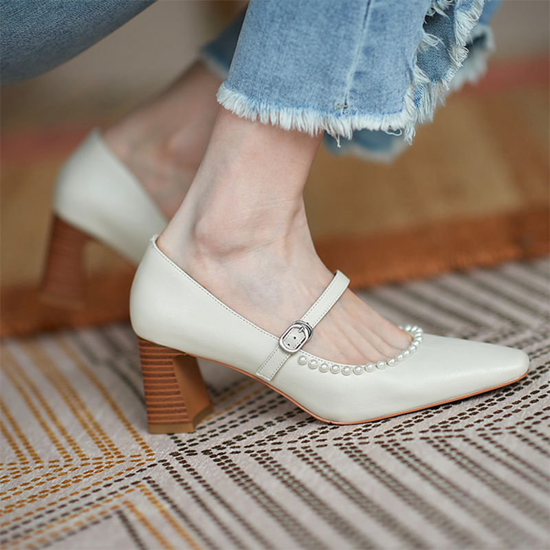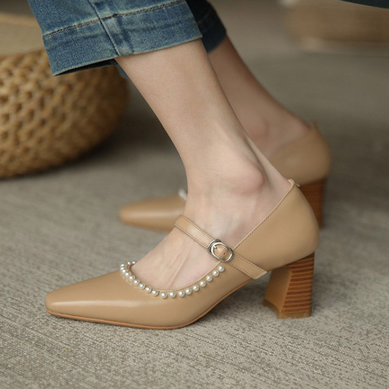 Spring Women Mary Janes Shoes Pearls Pumps High Heels Dress Shoes String Bead Retro Chunky Ladies Shoe zapatos mujer 8963N