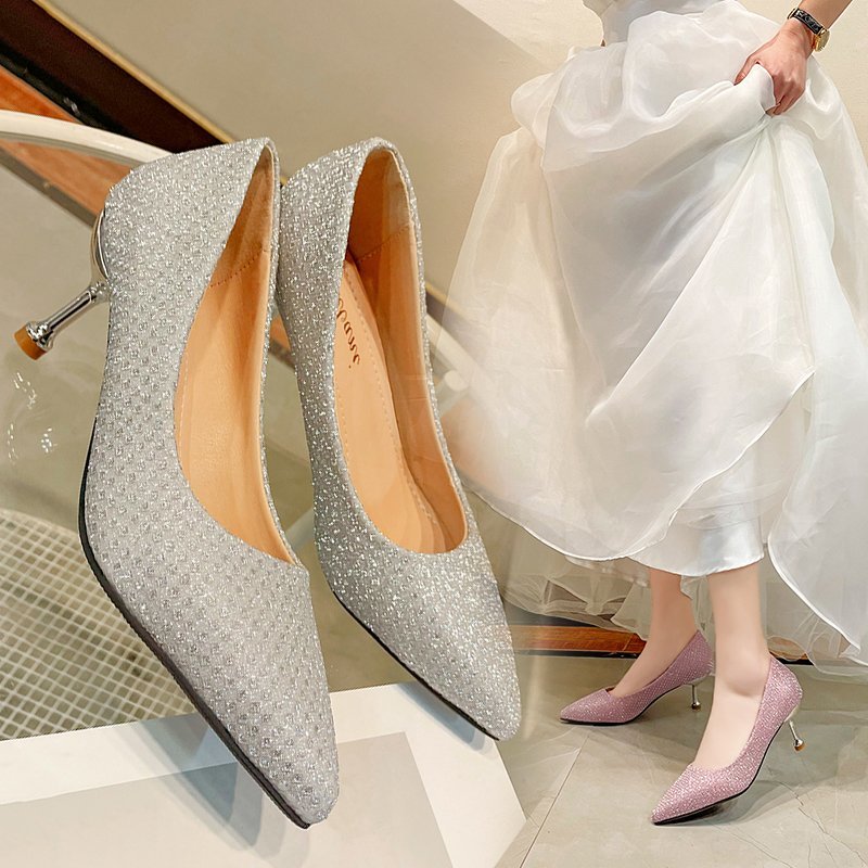 Spring Autumn Women Wedding Shoes Bling Pumps Sequined Cloth High Heels Dress Shoes Thin Heeled Ladies Boat Shoes Silver 8970N