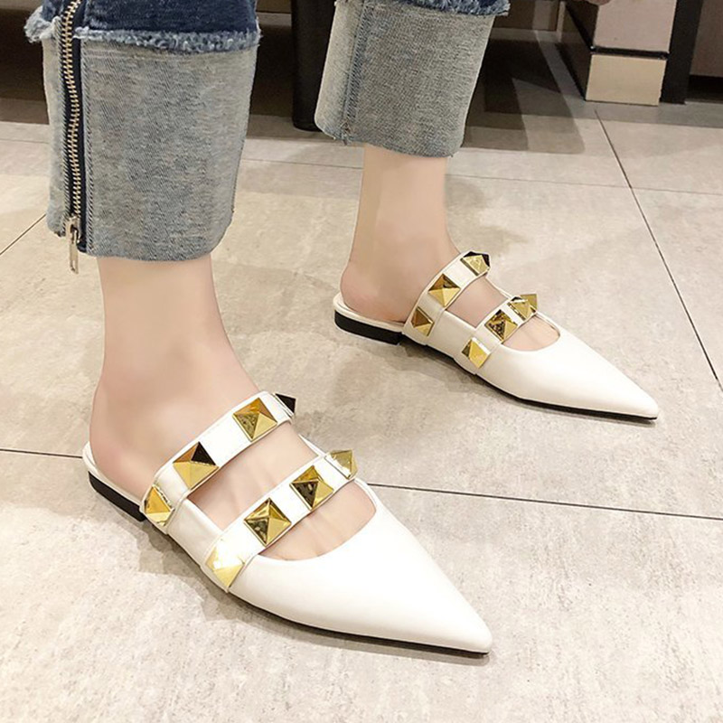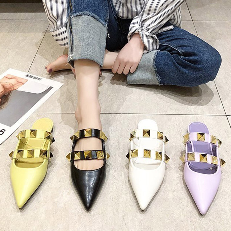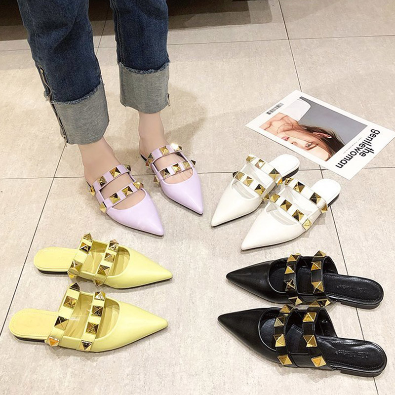 Spring Summer Women Slippers Rivets Mules Pointed Toe Slipper Flat Shoes Black Casual Shoes Ladies Out Side Slides 8986N