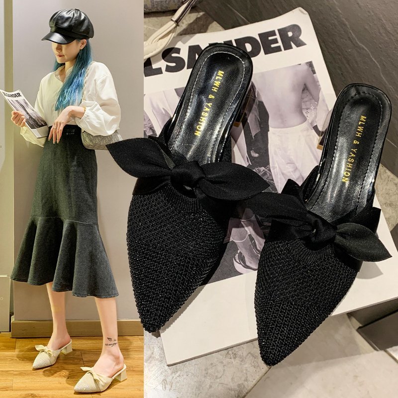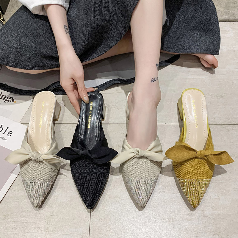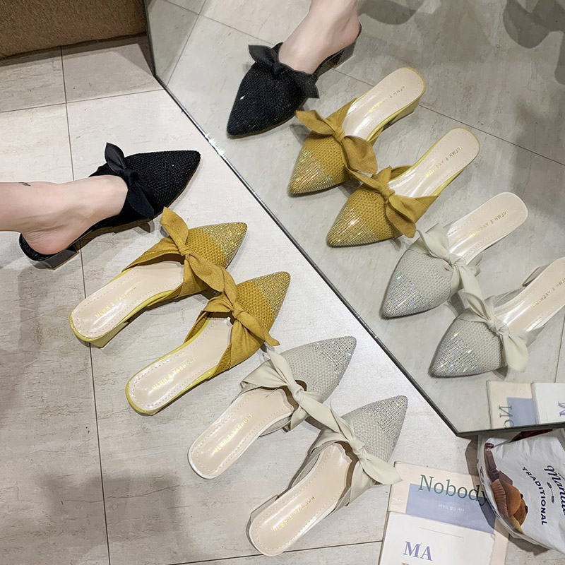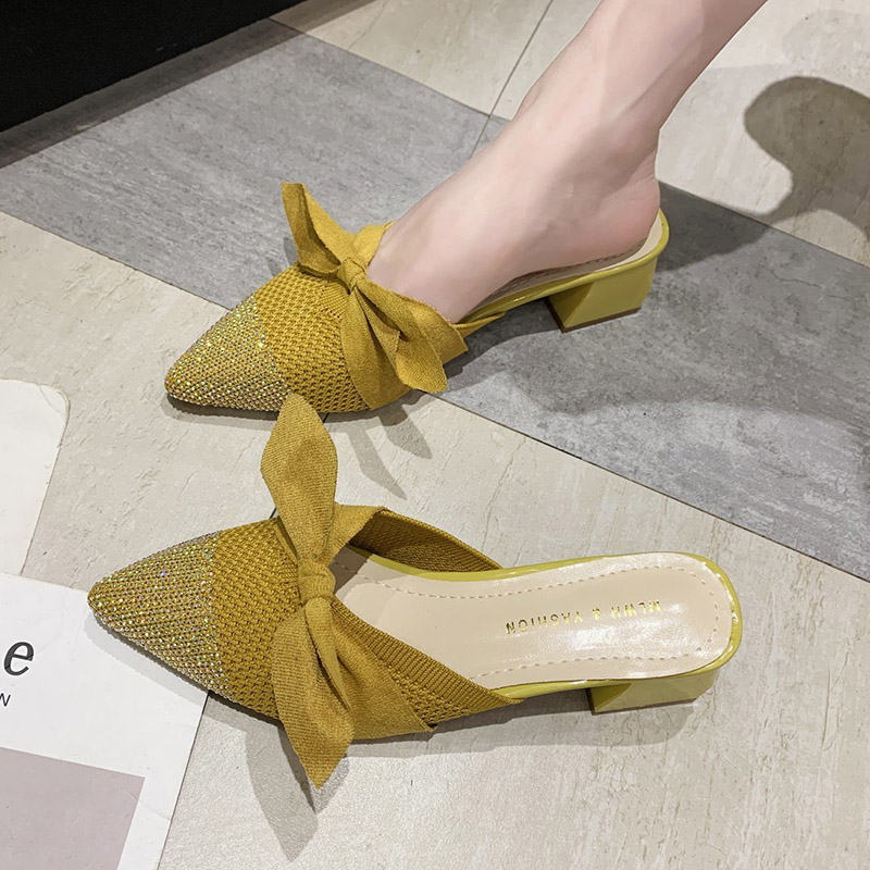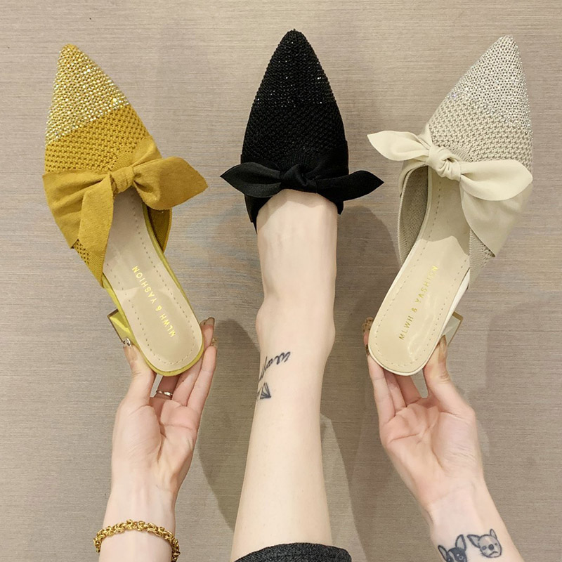Spring Summer Women Knitting Slippers Bling Bow Slides Woman Shoes Hollow Breathable Ladies High Heels Casual Shoes 9009N