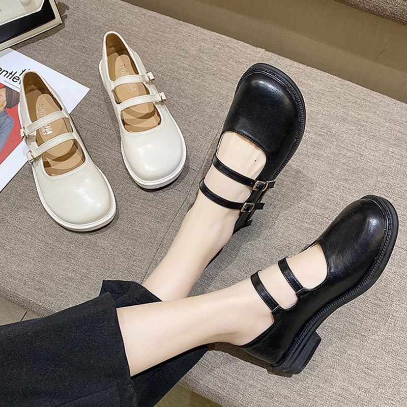 Spring Women Flats Double Buckle Mary Janes Low Heels Casual Shoes Black White Lolita Shoes Girls Round Toe Shallow 9035N