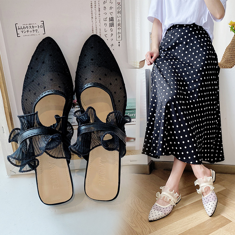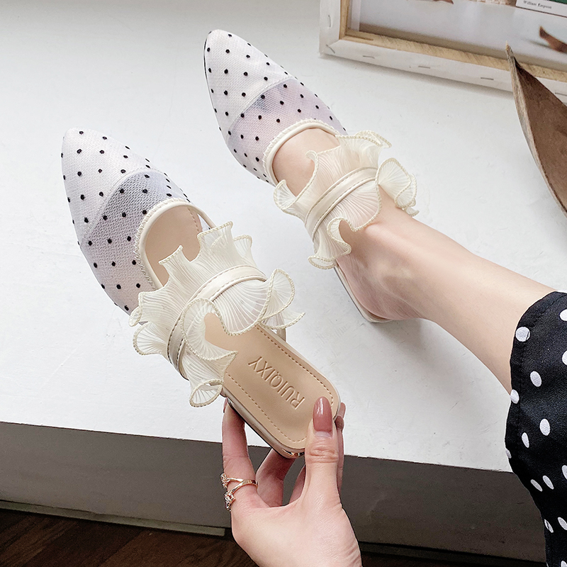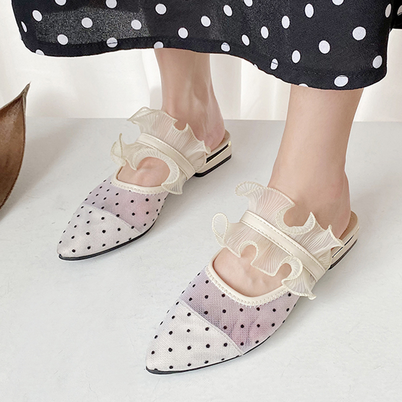 Summer Women Slippers Pointed Toe Dot Mesh Modern Slipper Ruffles Gauze Slides Ladies Shoes Fashion zapatos mujer 9053N
