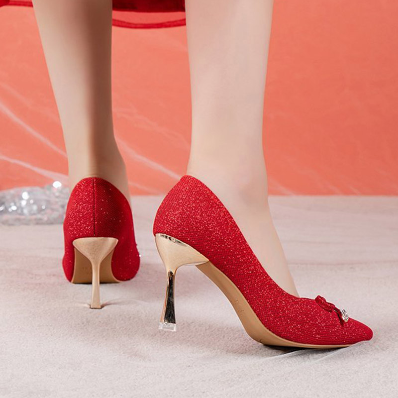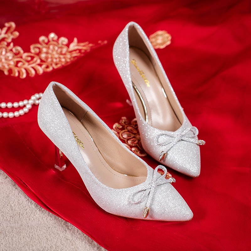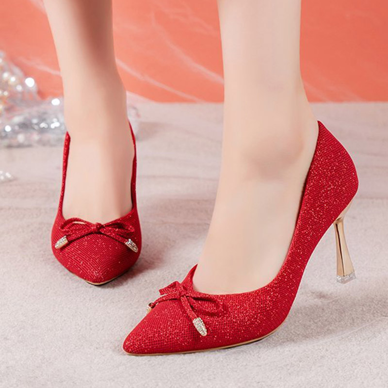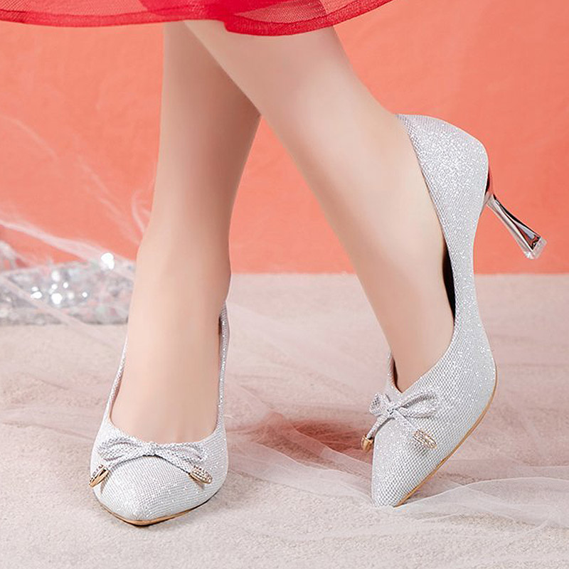 HomeWomen's Shoes Plus Size 34-42 Women Pumps High Heels Dress Shoes Women Wedding Shoes Bridal Silver Red Ol Office Lady Shoe Bow Thin Heel 9079N