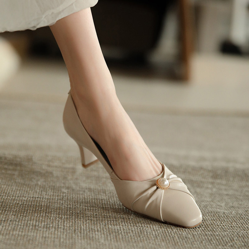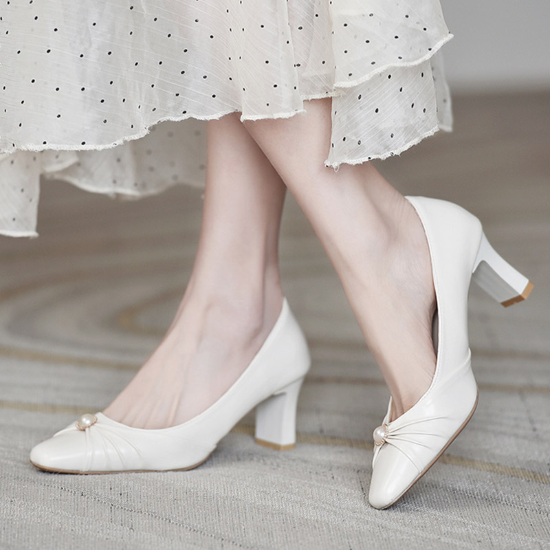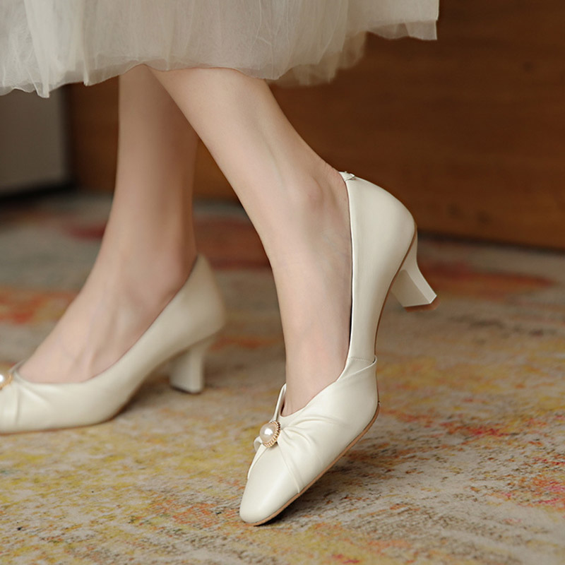Plus Size 34-43 Women Pumps Pointed Toe Dress Shoes High Heels Boat Shoes Pearls Wedding Shoes Bridal Ol Office Lady Shoe 9111N