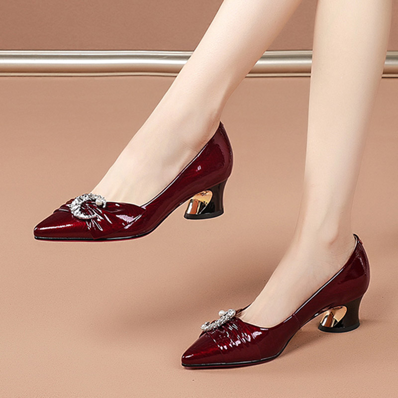 Plus Size 35-42 Women Pumps Pearls Patent Leather Boat Shoes Med Heels Dress Shoes Moon Crystal Pointed Toe Ladies Shoes 9120N