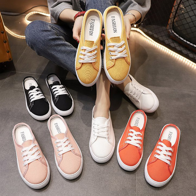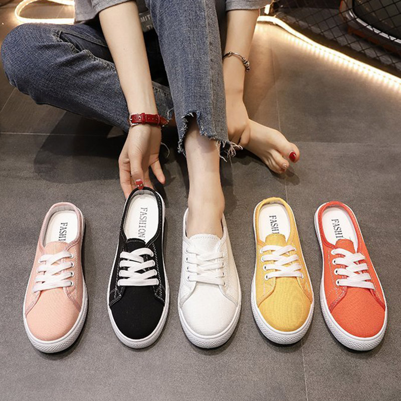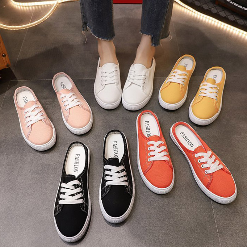 HomeWomen's Shoes Women Sneakrs Candy Color Canvas Slippers Lace Up Casual Shoes Slip on Flat on White Shoes Ladies Espadrilles Black Slides 9125N