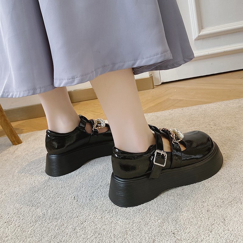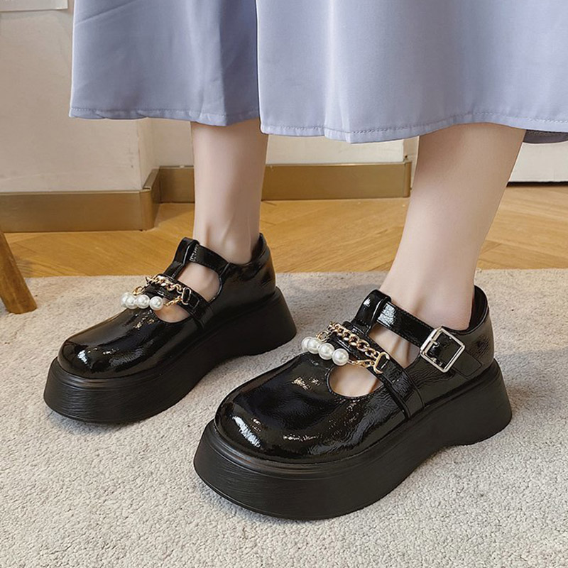 Lolita Shoes Pearls T Strap Shoes Patent Leather Flat on Platform Shoes Women Thick Sole Chain Mary Janes Shoes Girls 9141N