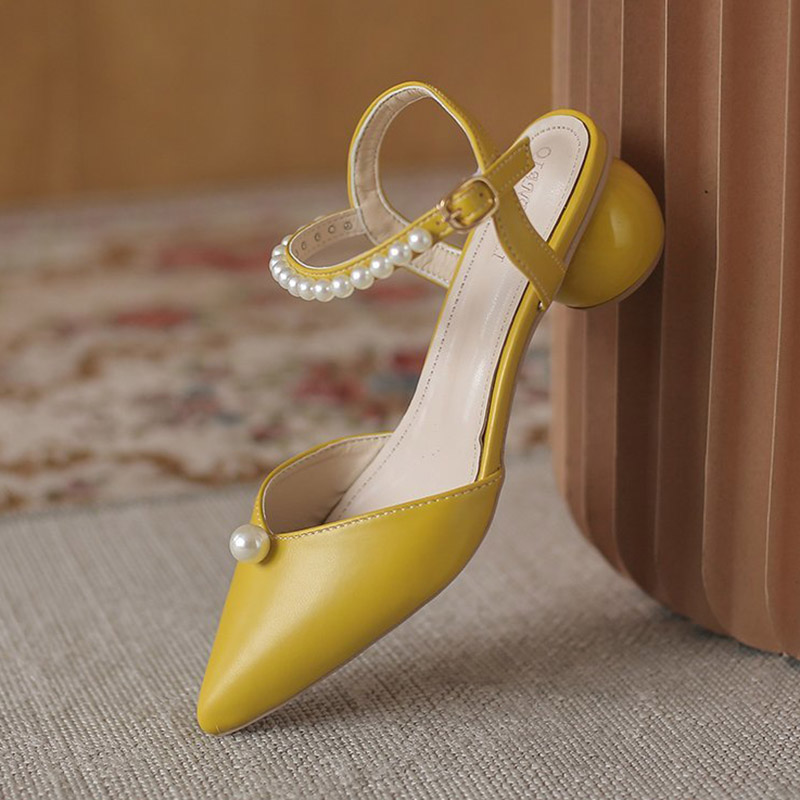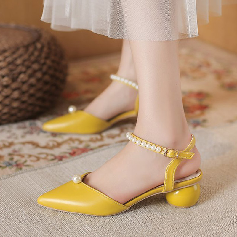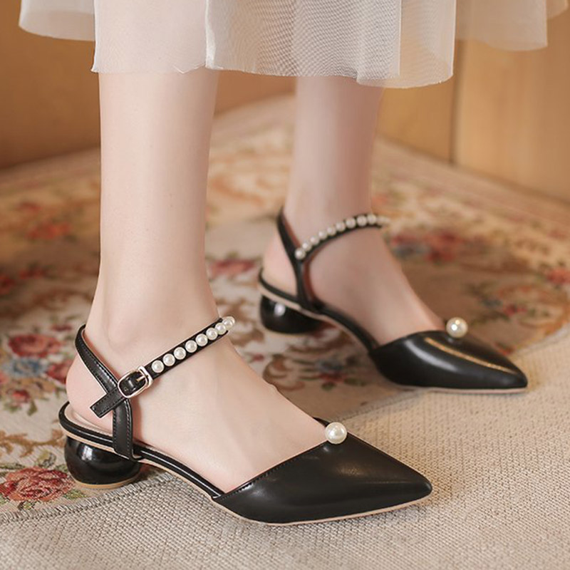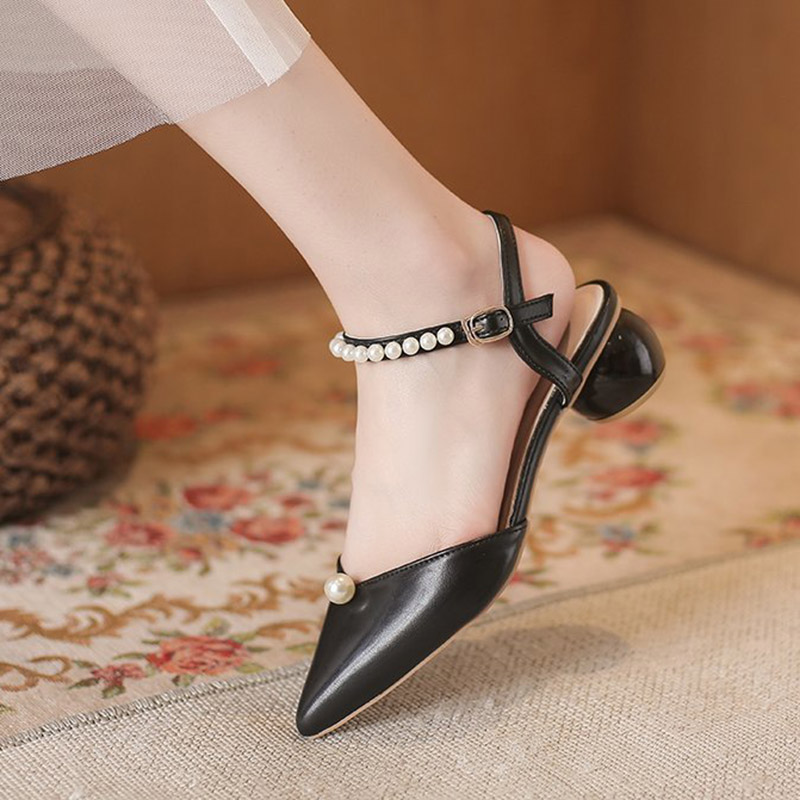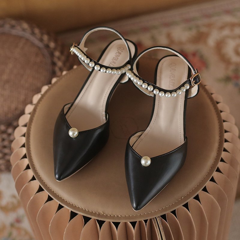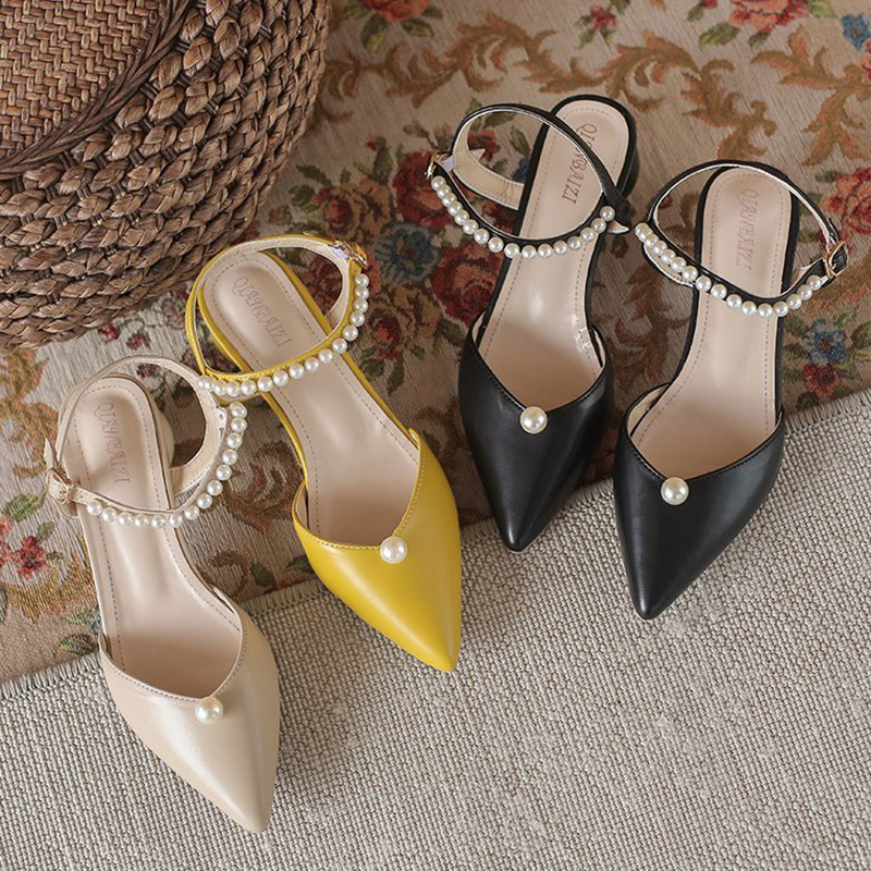 Woman Sandals String Bead Pointed Toe Ankle Strap Dress Shoes Pearls Pointed Toe Round Heeld Sandalias mujer Summer 9153N