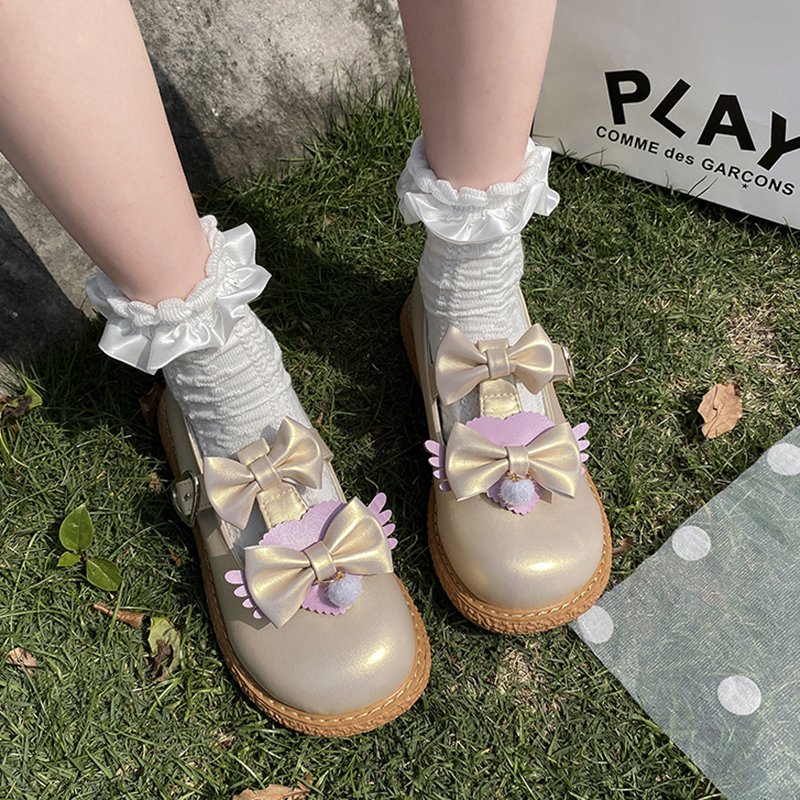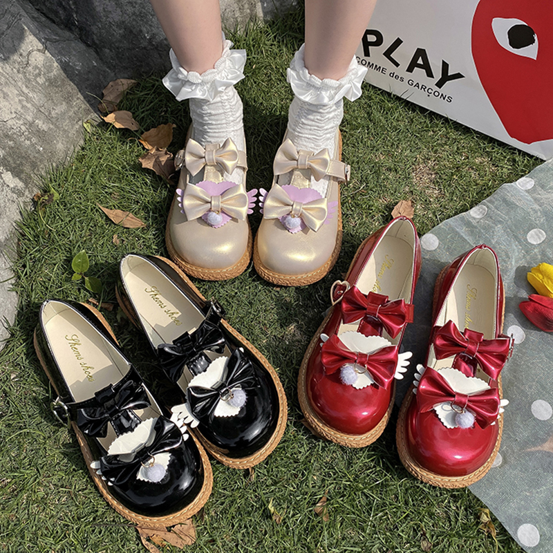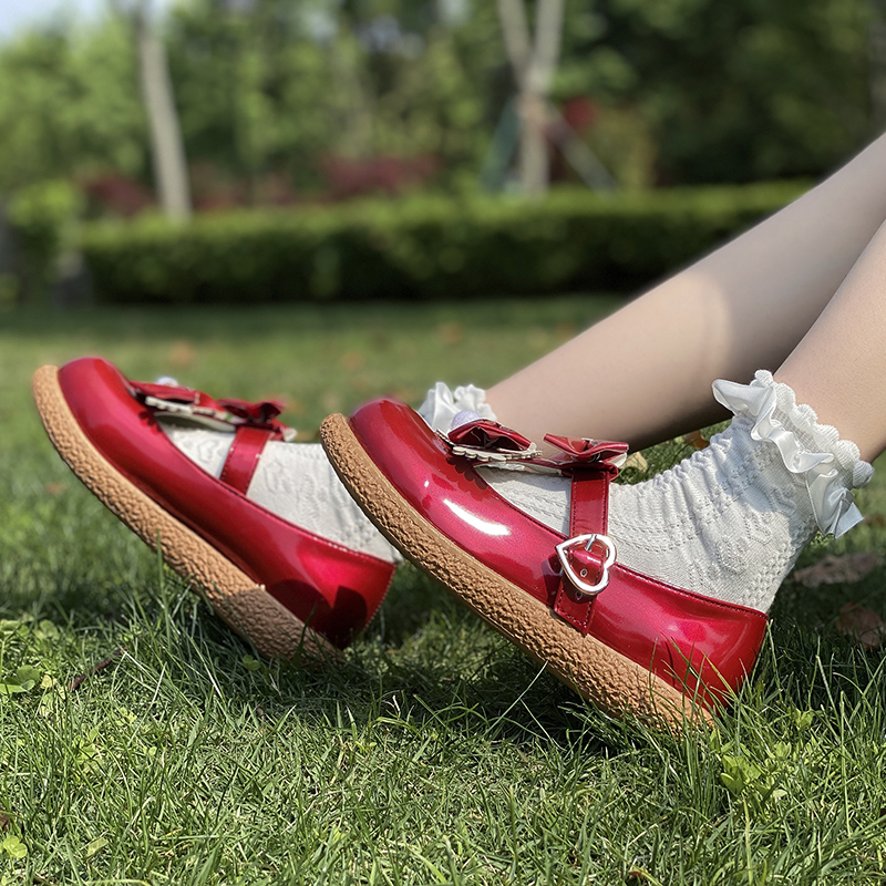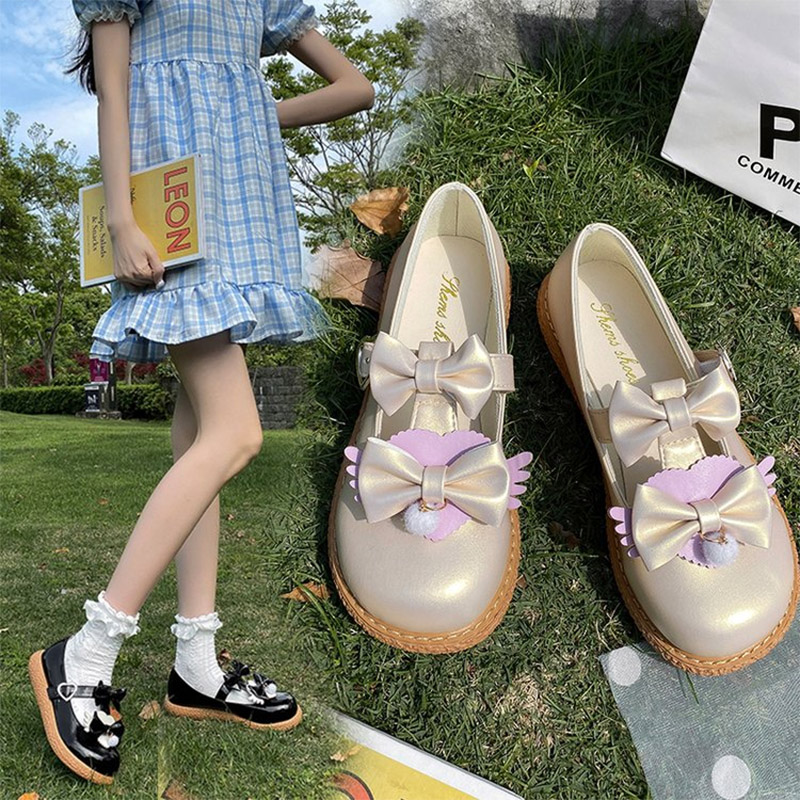 Lolita Shoes Double Bowtie Mary Janes Shoes Woman Oxford Shoes Heart Buckle Leather Casual Shoes Girls Princess Shoes 9173N