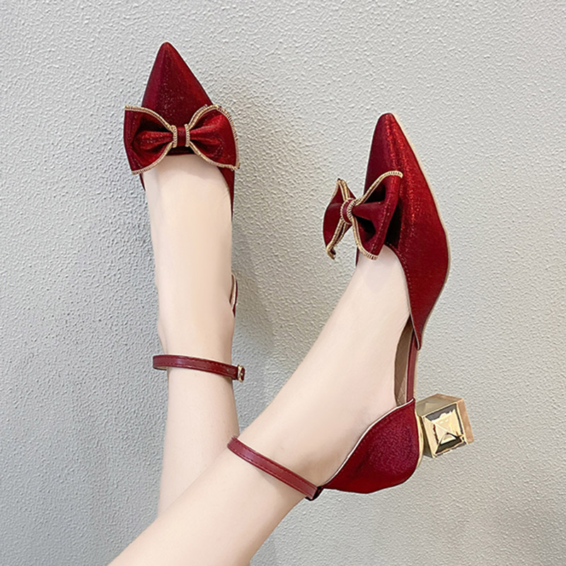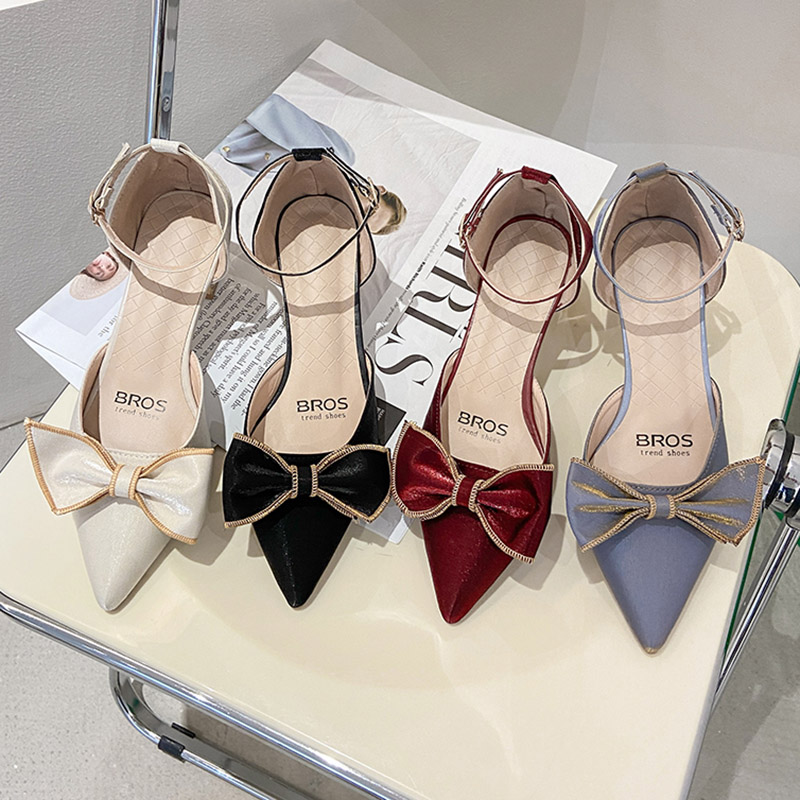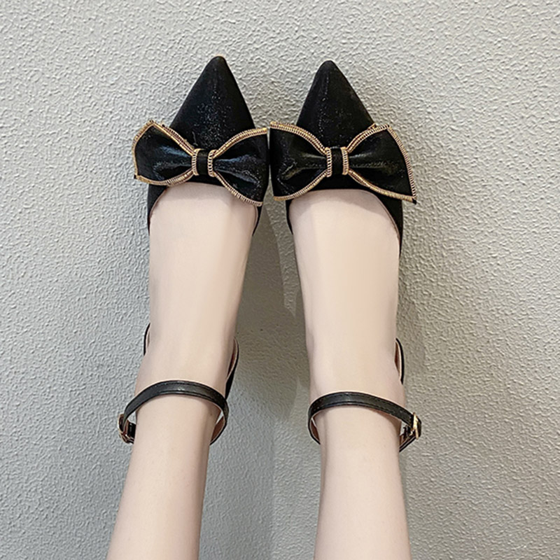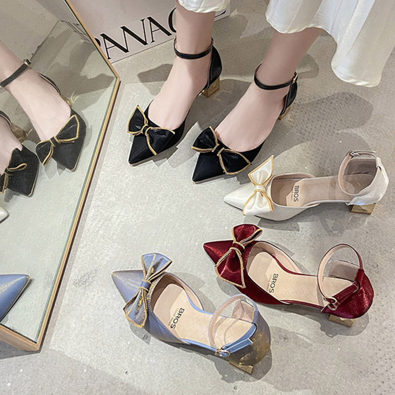 Women Sandals Summer Shoes Woman Ankle Strap Pumps Bowtie Pointed Toe Dress Shoes Gold Med Heels Office Lady Shoe 9247N