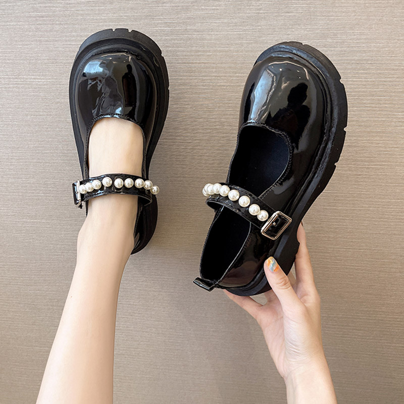 Lolita Shoes Women Platform Mary Janes Shoes Beading Patent Leather Casual Shoes Round Toe Pearls Thick Sole Girls Student 9253N