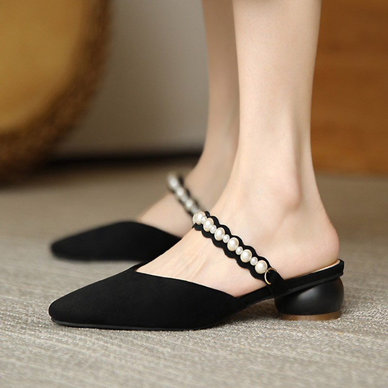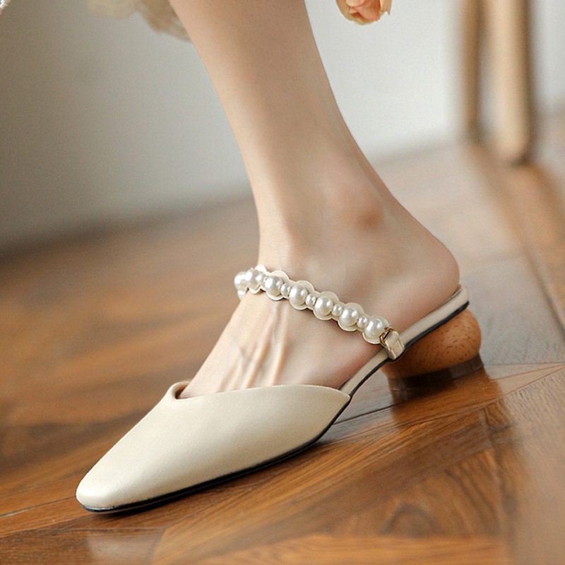 Women Slippers Summer Shoes Woman Dress Shoes Pearls Pointed Toe Slipper Mules Bead Round Heels Slides Ladies Shoe 9272N