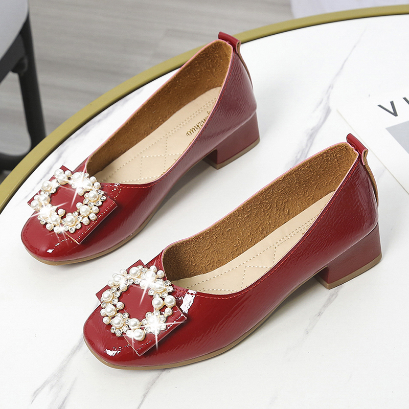 3cm Women Pumps Patent Leather Low Heels Dress Shoes Pearls Boat Shoes Square Heeled Crystal Ladies Shoes Ol Office Red 9293N