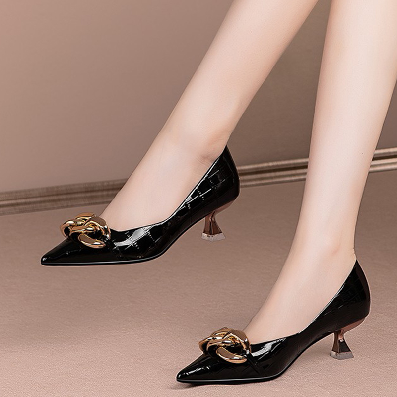 HomeWomen's Shoes Ol Office Lady Shoe Women Boat Shoes Metal High Heels Black Sexy Heels Chain Basic Pumps Pointed Toe Dress Shoe Embossing 9306N