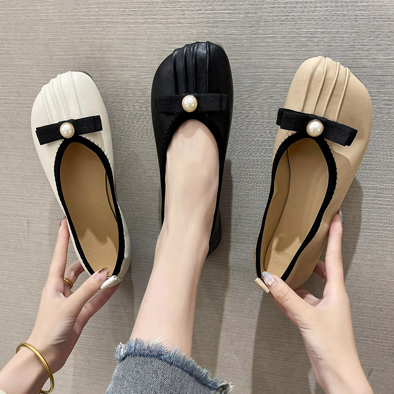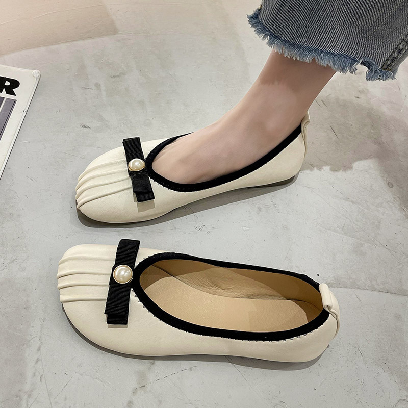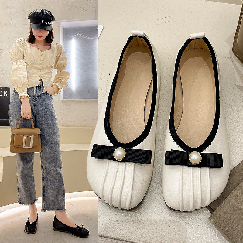Spring Autumn Women Flats Square Toe Boat Shoes Pearls Slip on Flat Shoes Woman Loafer Bow Fashion Ladies Shoe White Black 9326N