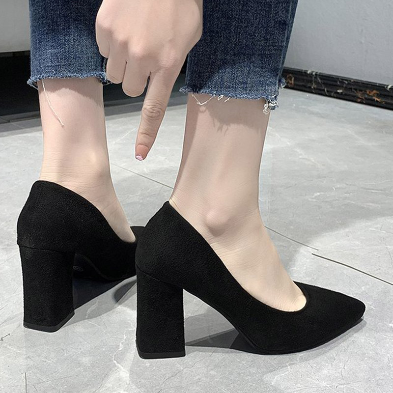 Plus Size Women High Heels Dress Shoes Flock Basic Pumps Pointed Toe Boat Shoe Square Heel Ladies Shoe Zapatos Mujer Black 9339N