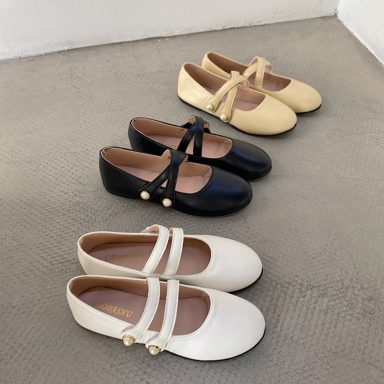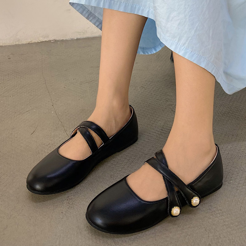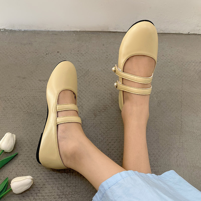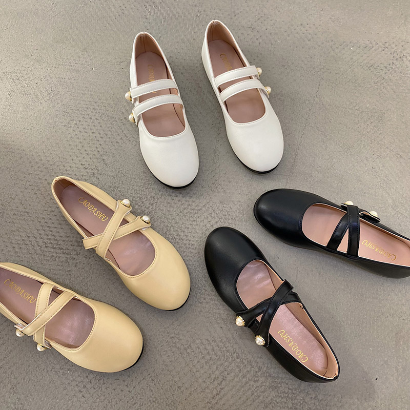 Women Ballet Flats Autumn Cross-tied Mary Janes Shoes Woman Boat Shoes Pearls Leather Casual Shoes Black White Yellow 9353N