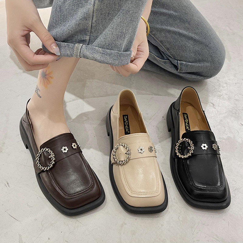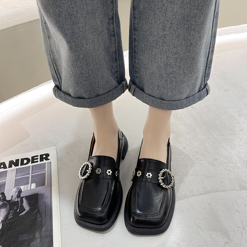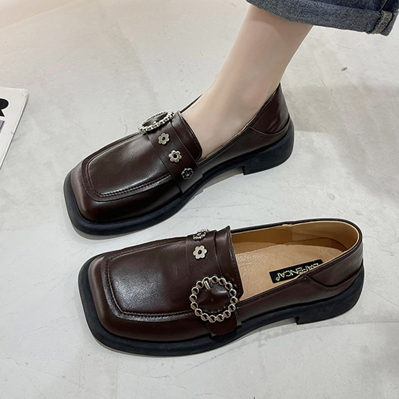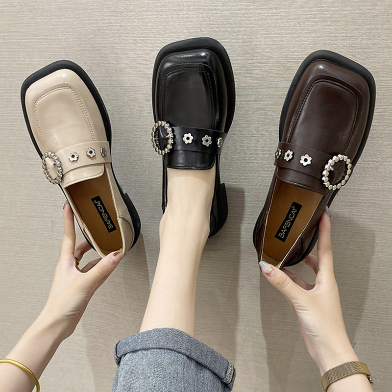 Women Loafers Autumn Square Toe Slip on Shoes Crystal Buckle Oxford Shoes Rivets Leather Casual Shoes Zapatos Mujer 9369N