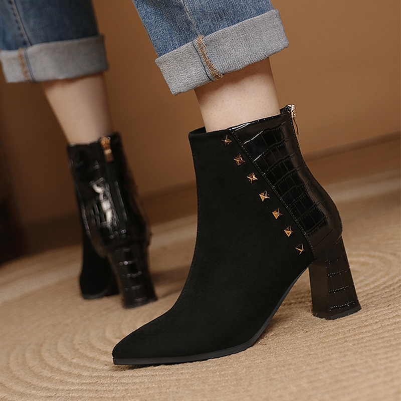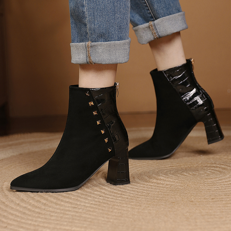 Women Ankle Boots Winter Pointed Toe Fashion Boots Faux Suede High Heels Dress Shoes Rivets Chunky botas mujer Black 9395N