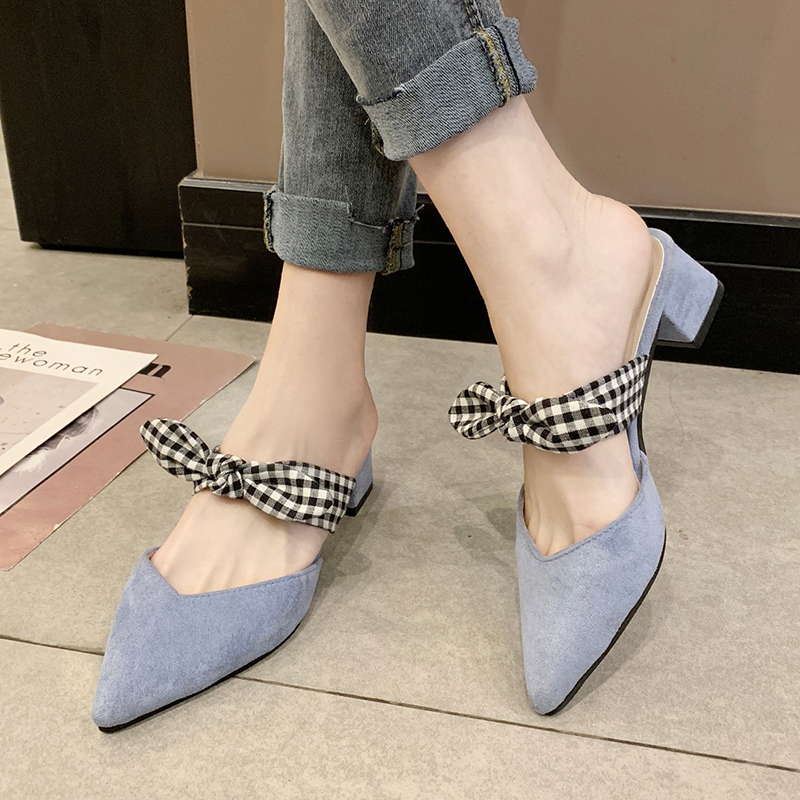 Women Slippers Plaid Bow Pointed Toe Slipper Spring Woman Shoes Square Heels Slides Ladies Dress Shoes zapatos mujer 7999N