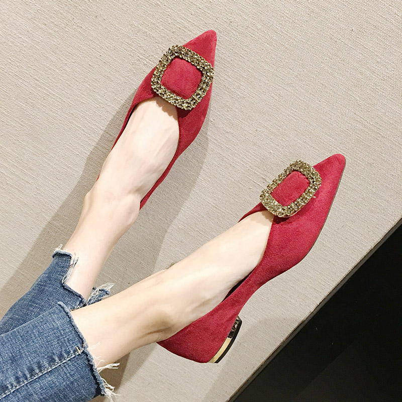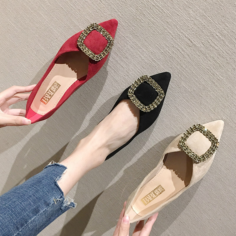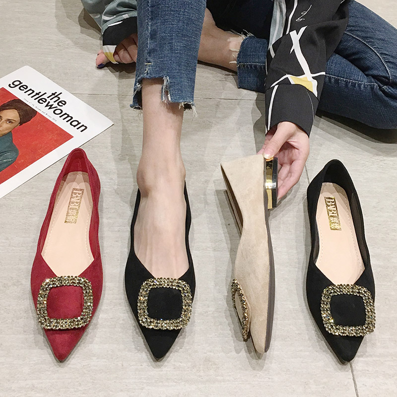 Spring Woman Flats Pointed Toe Boat Shoes Faux Suede Slip on Flat Shoes Gold Heels Metal Ladies Shoes Women Black Red 8005N