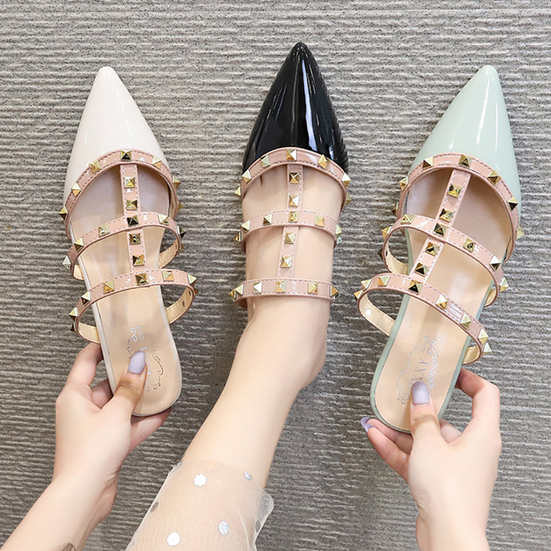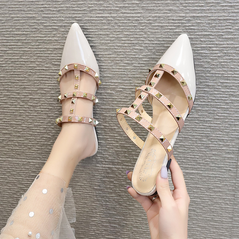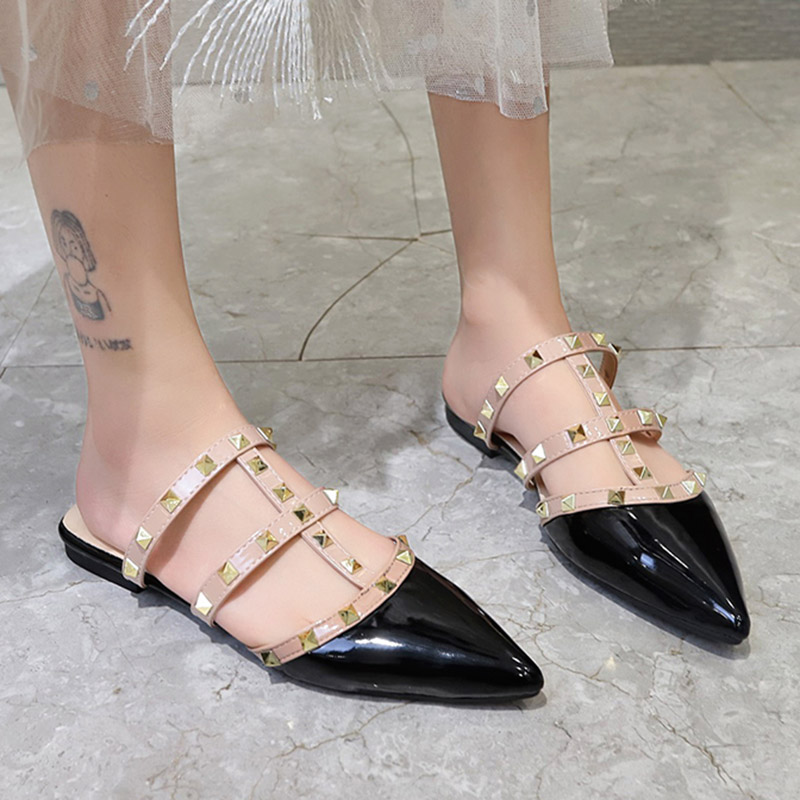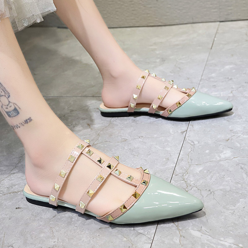 Summer Women Slippers Patent Leather Pointed Toe Slipper Rivets Slides Flat Shoes Woman Slip on zapatos mujer mules 8037N