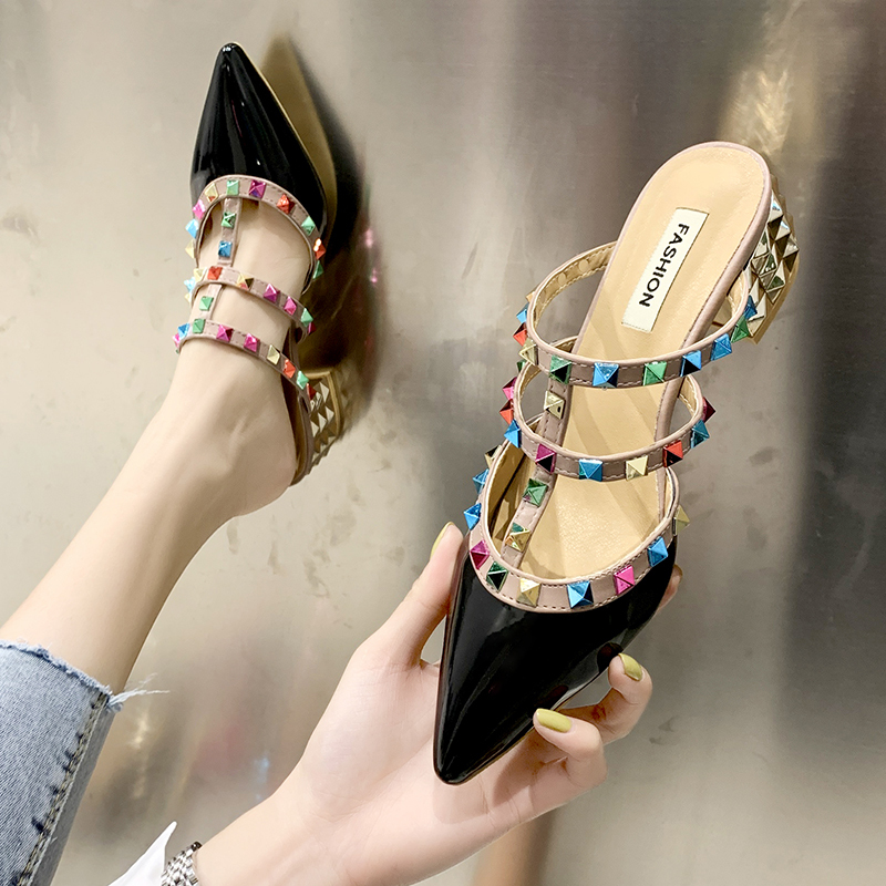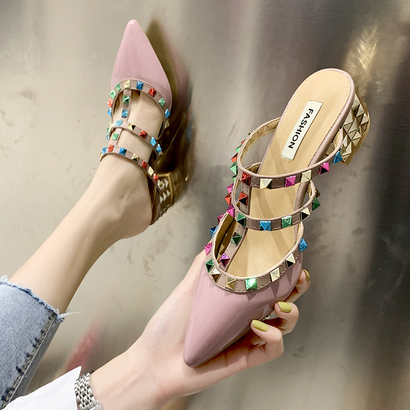 Spring Summer Women Slippers Patent Leather Rivets Slides Medium Heeled Dress Shoes Red Slipper zapatos mujer Pink 8040N