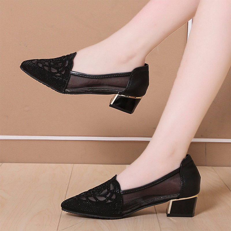 Plus Size 42 Women Pumps Mesh Boat Shoes Medium Heels Dress Shoes Woman Sandals Pointed Toe Hollow Out Pump zapatos mujer 8067N