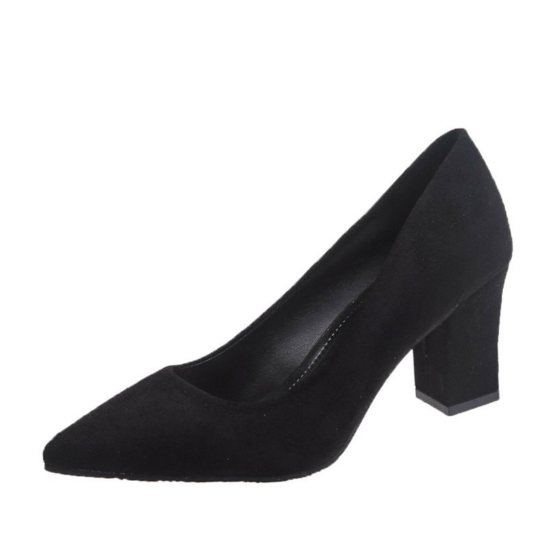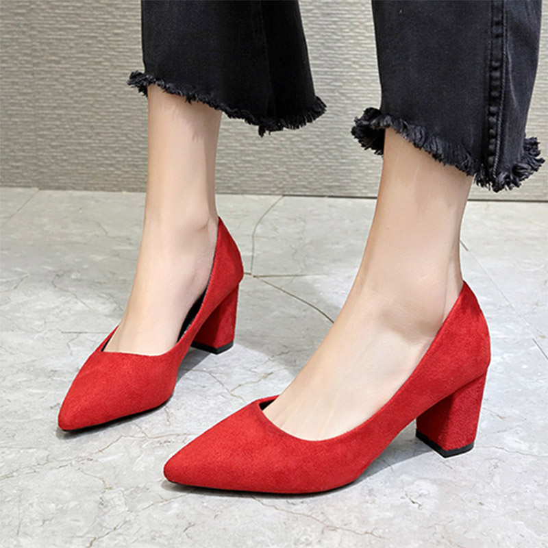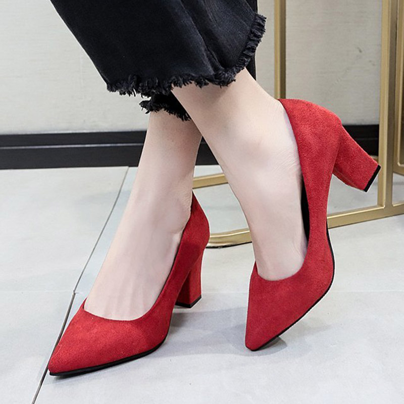 Women Pumps Square Heeled High Heels Dress Shoes Office Woman Faux Suede Boat Shoes Basic Pump zapatos mujer Red Black 8153N