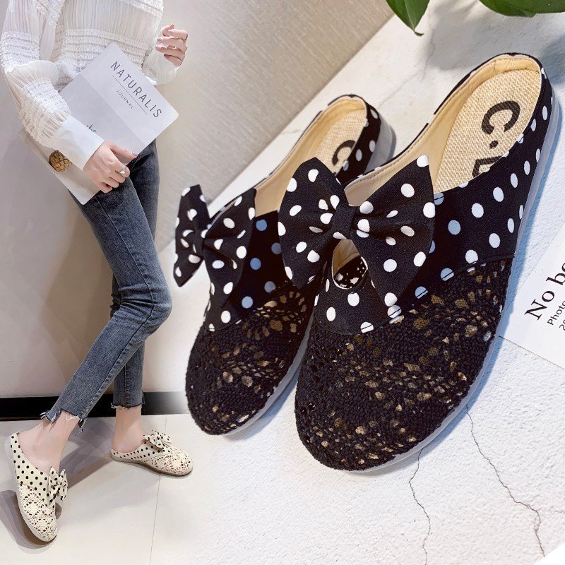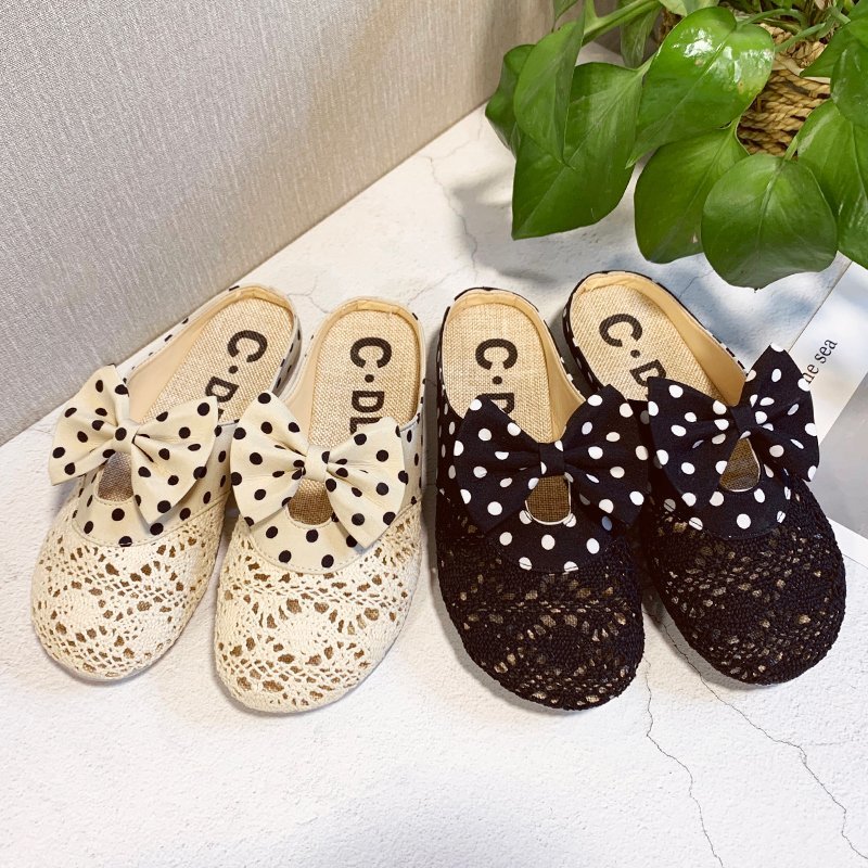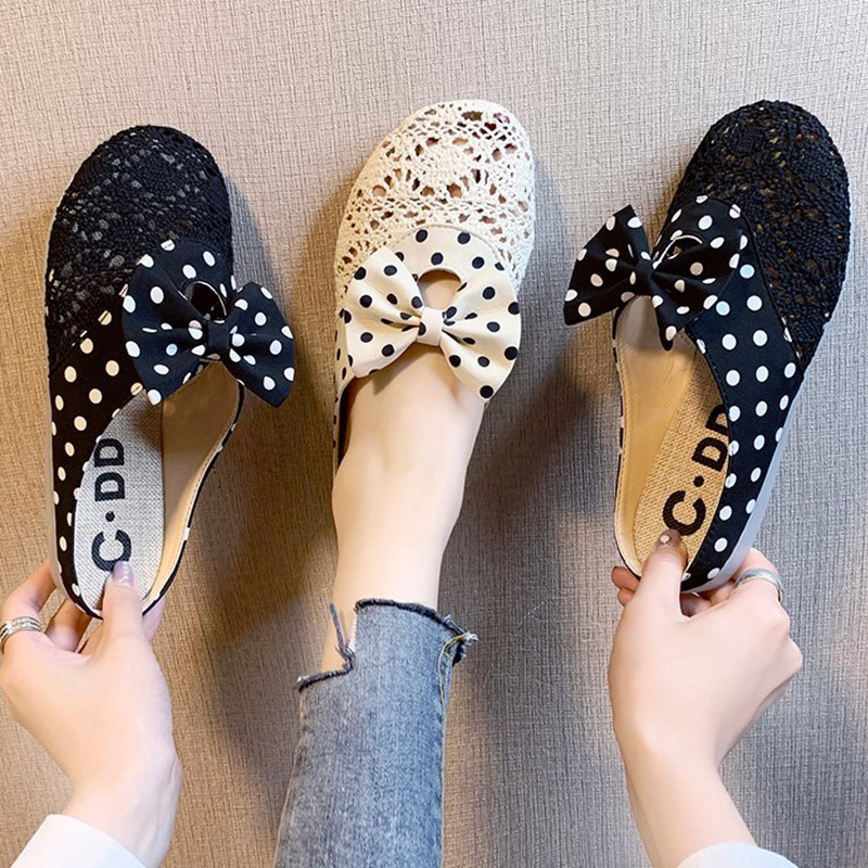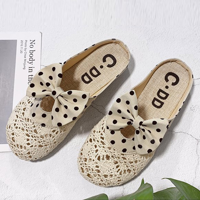 Women Bowtie Slippers Out Side Flax Hollow Outs Slides Slip on Flat Shoes Woman Dot Lace Round Toe Slipper Female mules 8186N