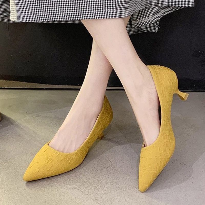 Spring Autumn 5cm Women Pumps Med Heels Dress Shoes Cotton Silk Boat Shoes Pointed Toe Ladies Shoes zapatos mujer Yellow 8308N