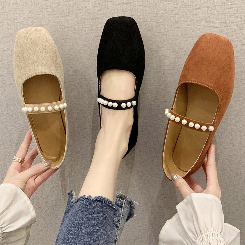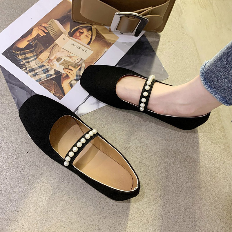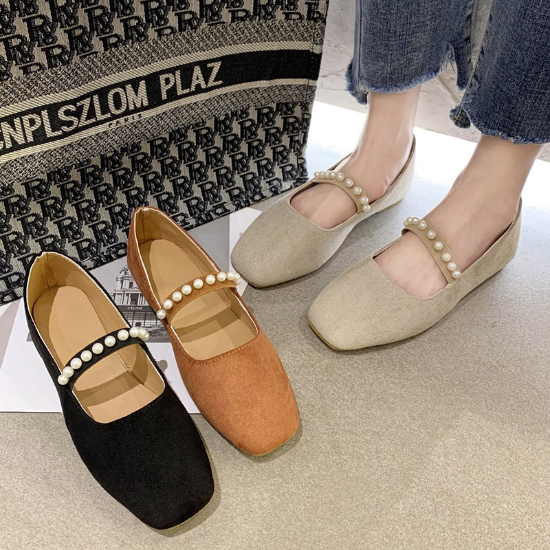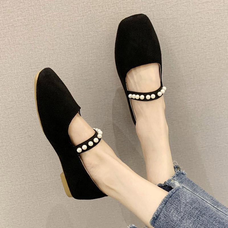 Autumn Women Flats String Bead Mary Janes Shoes Faux Suede Boat Shoes Square Toe Cute Pearl Ladies Shoe zapatos mujer 8379N