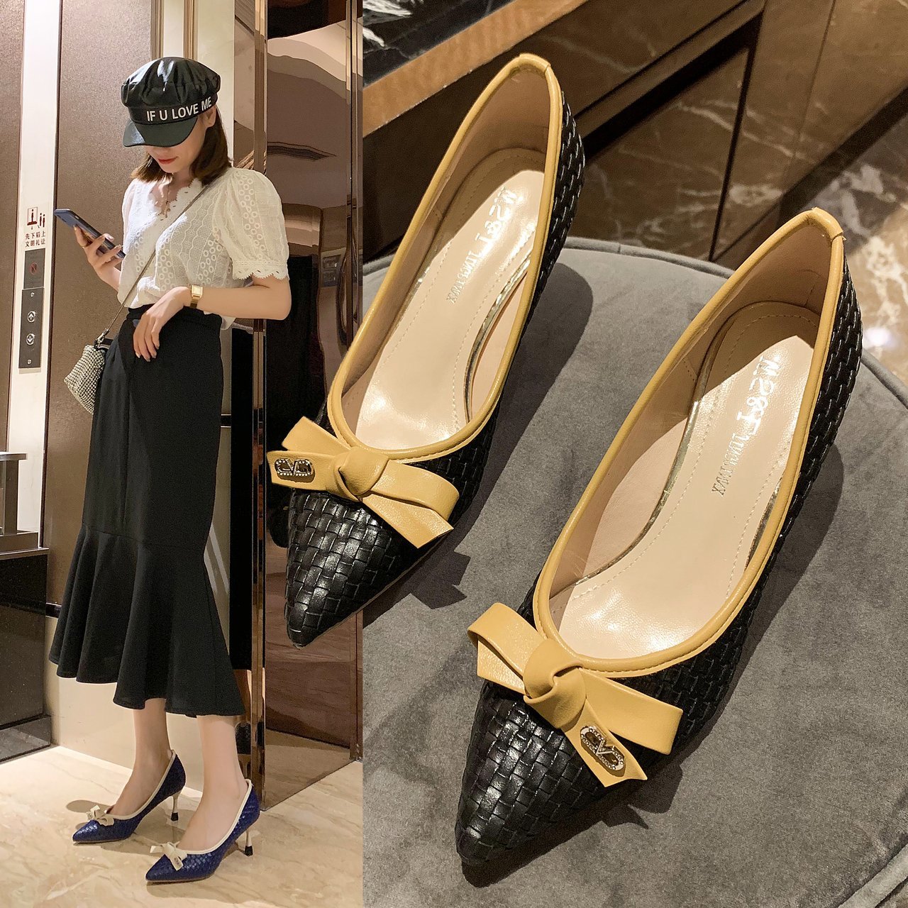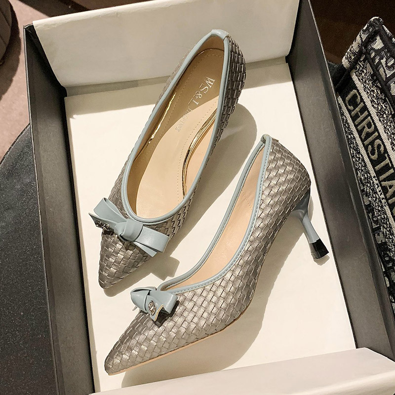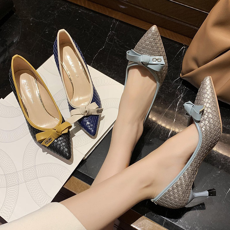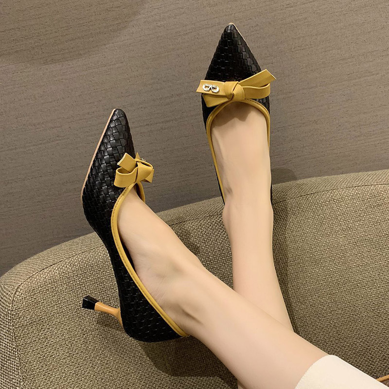 Autumn Spring Women Pumps Pointed Toe Dress Shoes Leather Weaving Stiletto High Heels Ladies Shoes Bowtie Boat Shoes 8385N