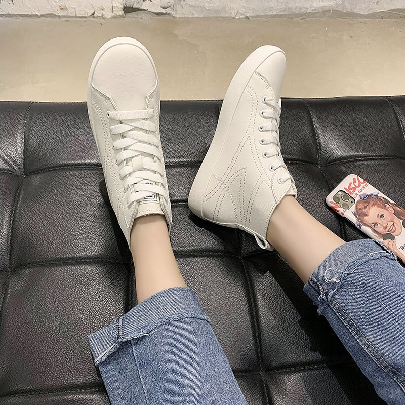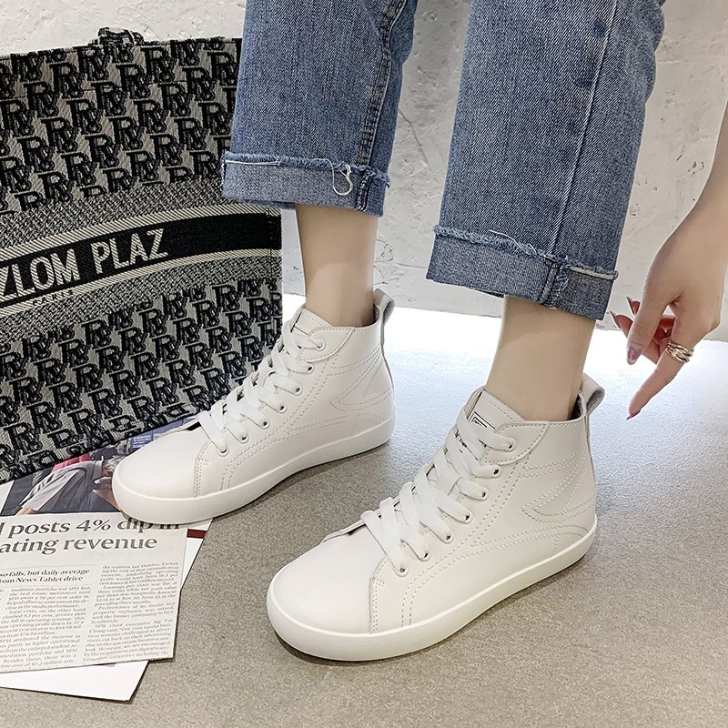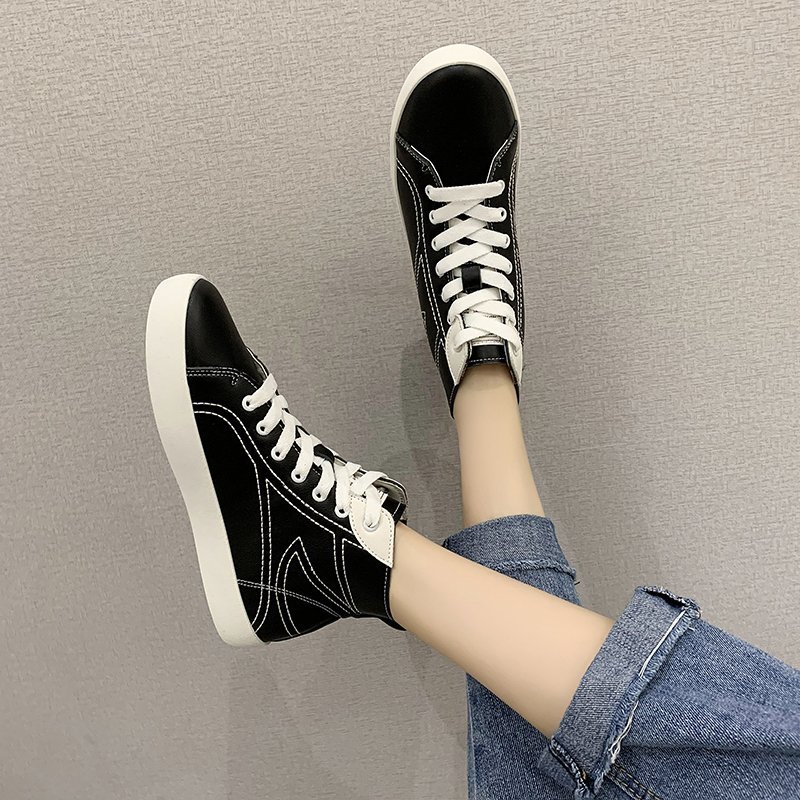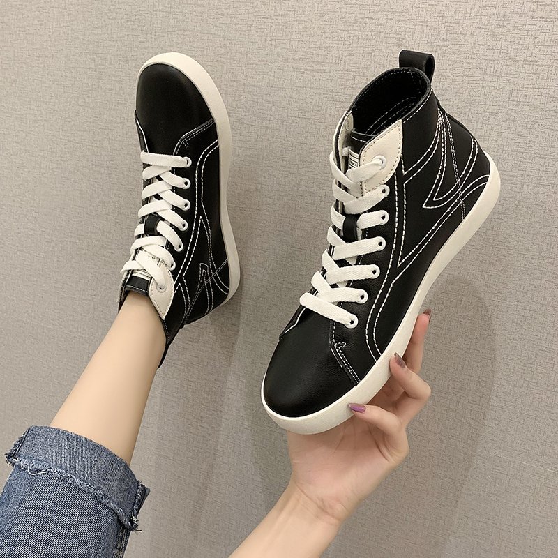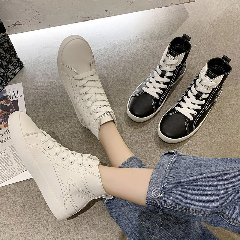 Autumn Women Sneakers High Top Casual Shoes Pu Leather Lace Up Ladies Shoes White Tennis Black Sewing zapatos mujer 8407N
