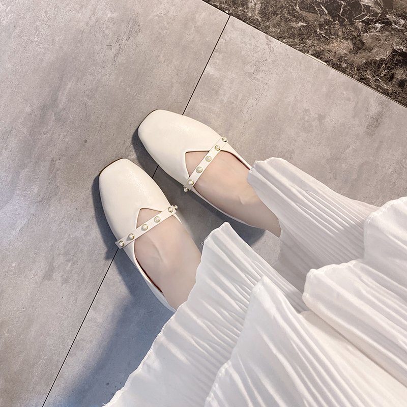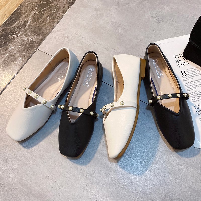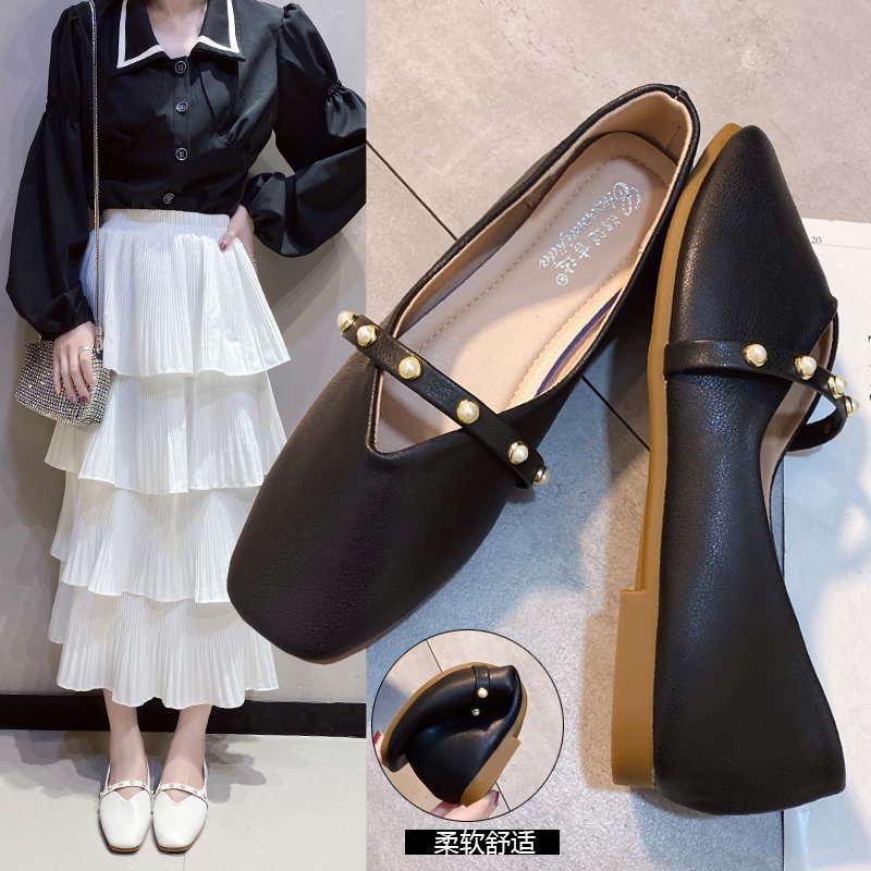 Women Flats Pearl Mary Janes Shoes Square Toe Slip on Flat Shoes Woman Girls Bead Princess Shoes Black White Spring Autumn 8513N