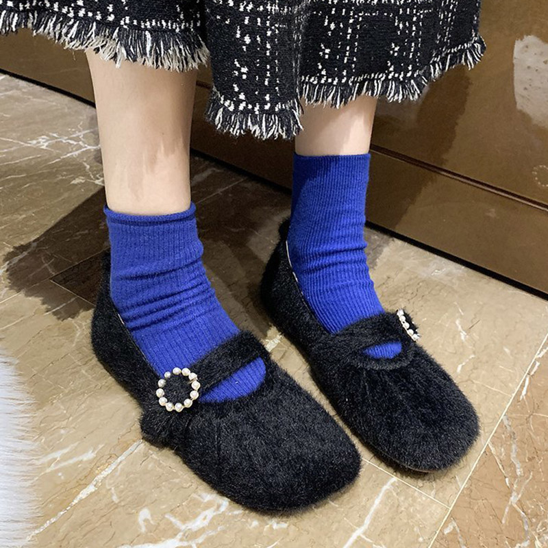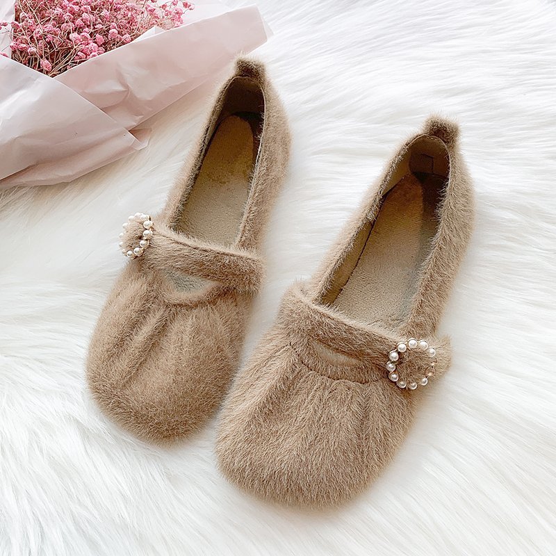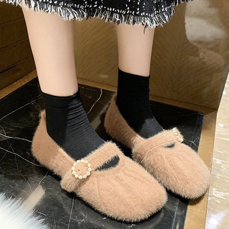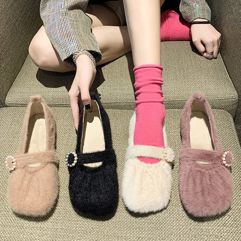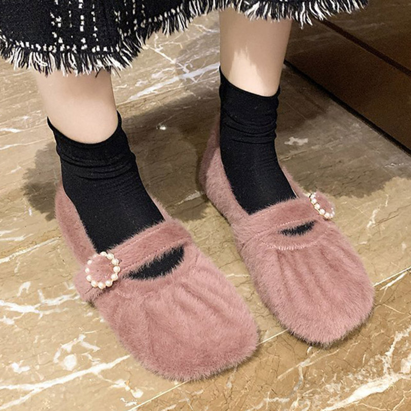 Fur Mary Janes Shoes for Women Warm Loafers Winter New Fashion Lolita Shoes Bead Buckle Flats Girls Casual Shoes 8520N
