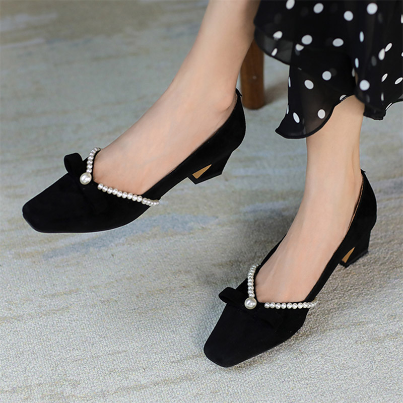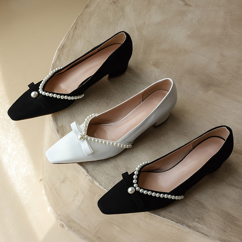 Women Wedding Shoes Bridal White Pearl Pumps String Bead Boat Shoes Square Mid Heels Dress Shoes Black Ladies Shoes 8575N