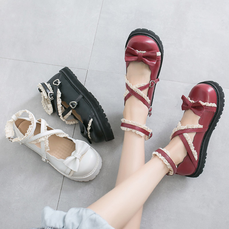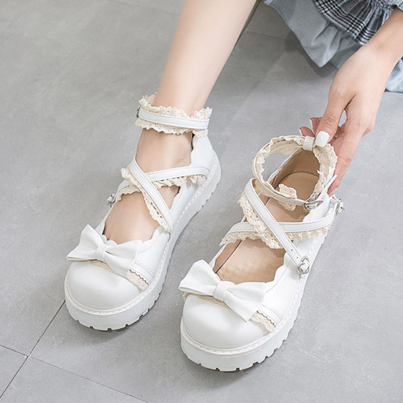 Lolita Shoes Retro Leather Shoes Women Cross-tied Mary Janes Shoes Bowtie Lace Girls Shoes Flat on Platform Casual Shoes 8596N