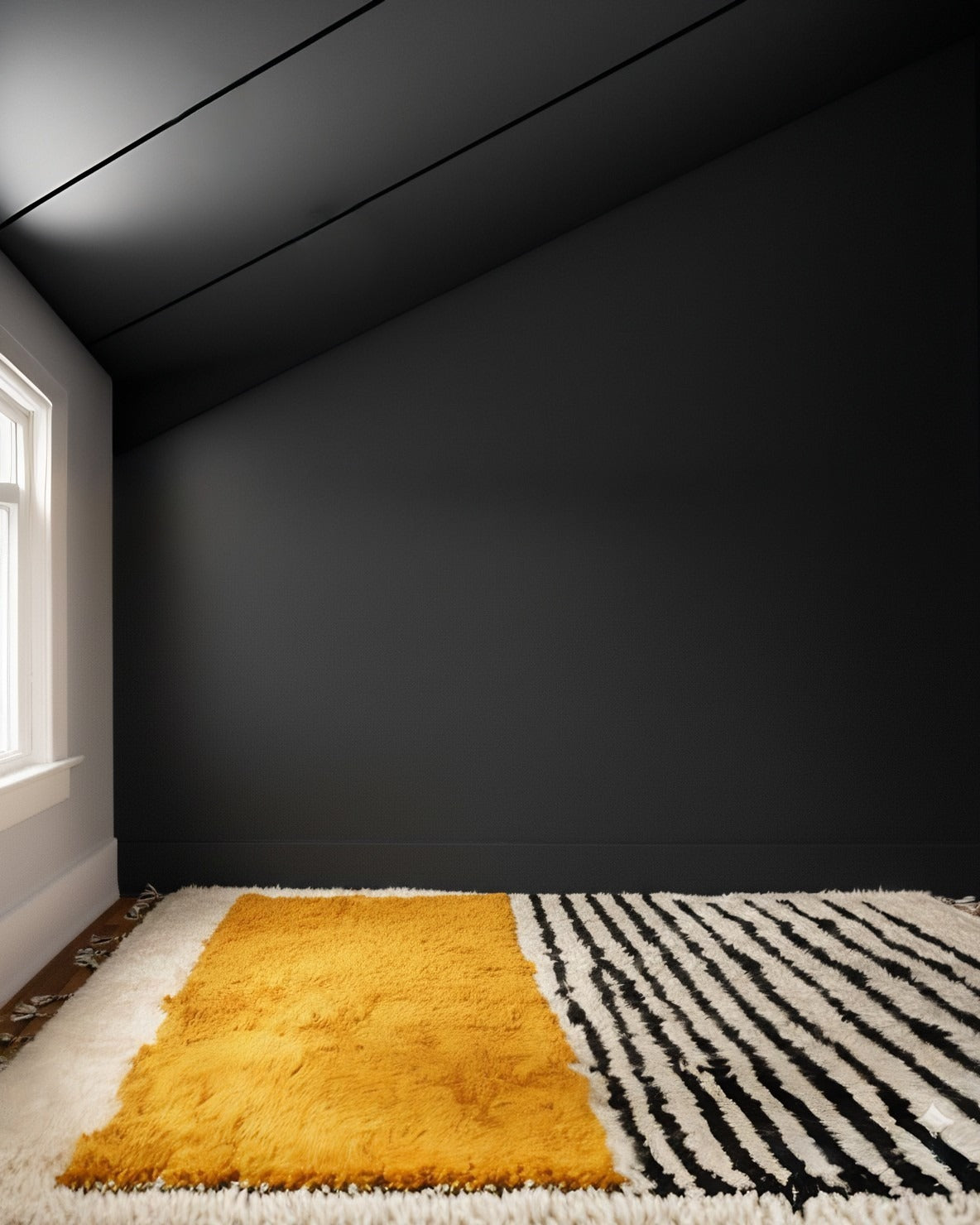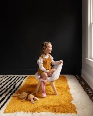 This isn’t just a rug; it’s the soul of the room. The ultra-thick wool shag texture invites you to lounge on the floor, making it a favorite spot for kids, pets, & adults alike. We love how the marigold section brings instant warmth to a space, while the unexpected mix of black and white stripes and adds a graphic, modern edge that keeps the look fresh.