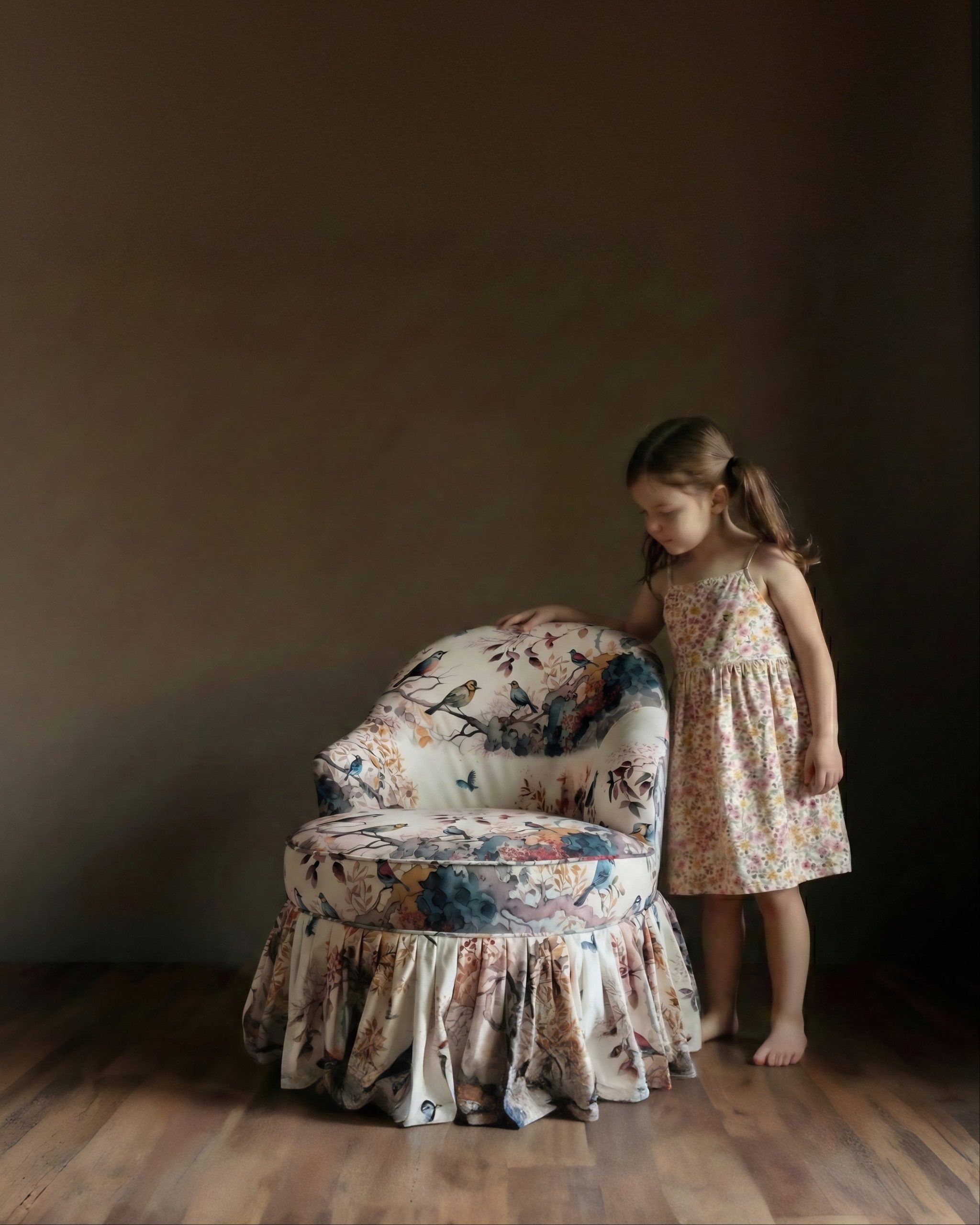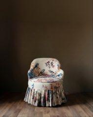 Introducing the Byrd Petite Ruffle Velvet Accent Chair, a truly enchanting piece that brings whimsical elegance and luxurious comfort to any room. Adorned with a delightful bird and botanical print, the Byrd sofa features plush velvet upholstery that is soft to the touch, ensuring a cozy and inviting experience. The vibrant pattern, showcasing a charming array of birds nestled amongst lush foliage and blossoms, creates a captivating focal point that will spark joy and conversation. A unique ruffled skirt adds a playful yet sophisticated detail, making the Florence sofa a perfect accent for a cozy reading nook, a sunlit conservatory, or a creatively styled living room.
